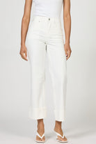 These high rise cuffed hem jeans in egret offer a stylish and versatile addition to your wardrobe.