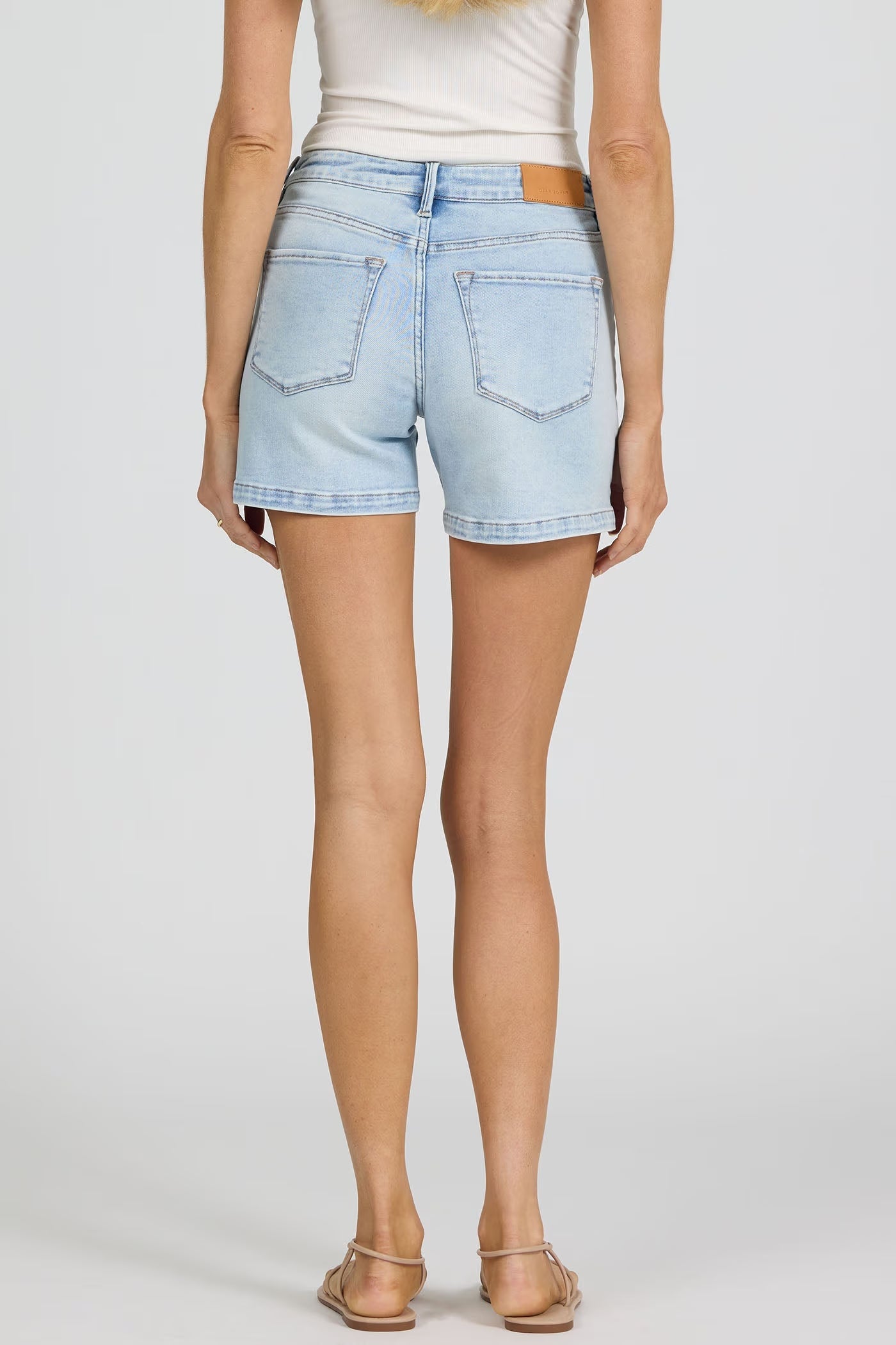 Step into effortless style with our mid rise clean hem denim shorts in a coveted light wash.