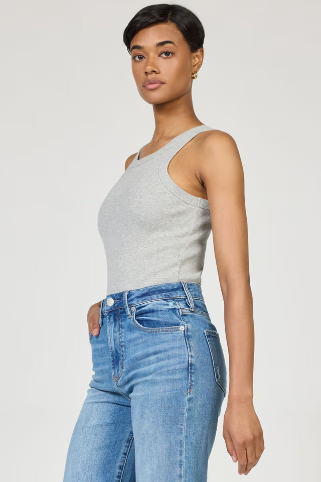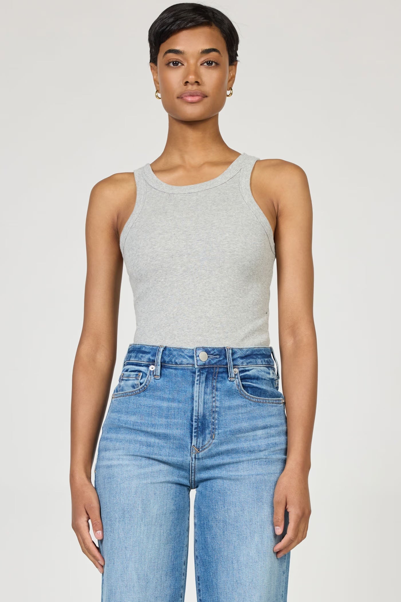 Elevate your casual wardrobe with this fitted crew neck racer back tank in a stylish heather grey shade.
