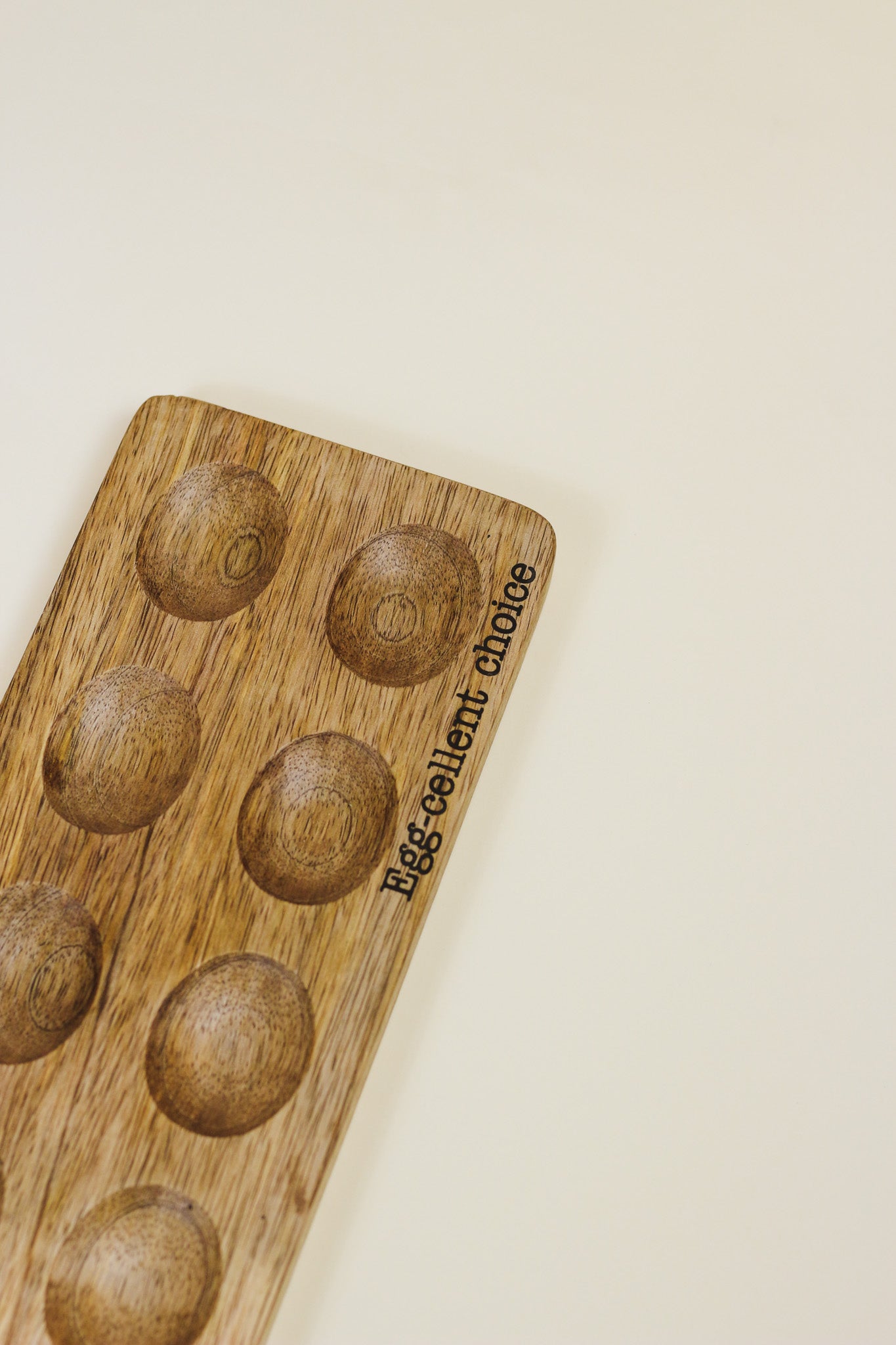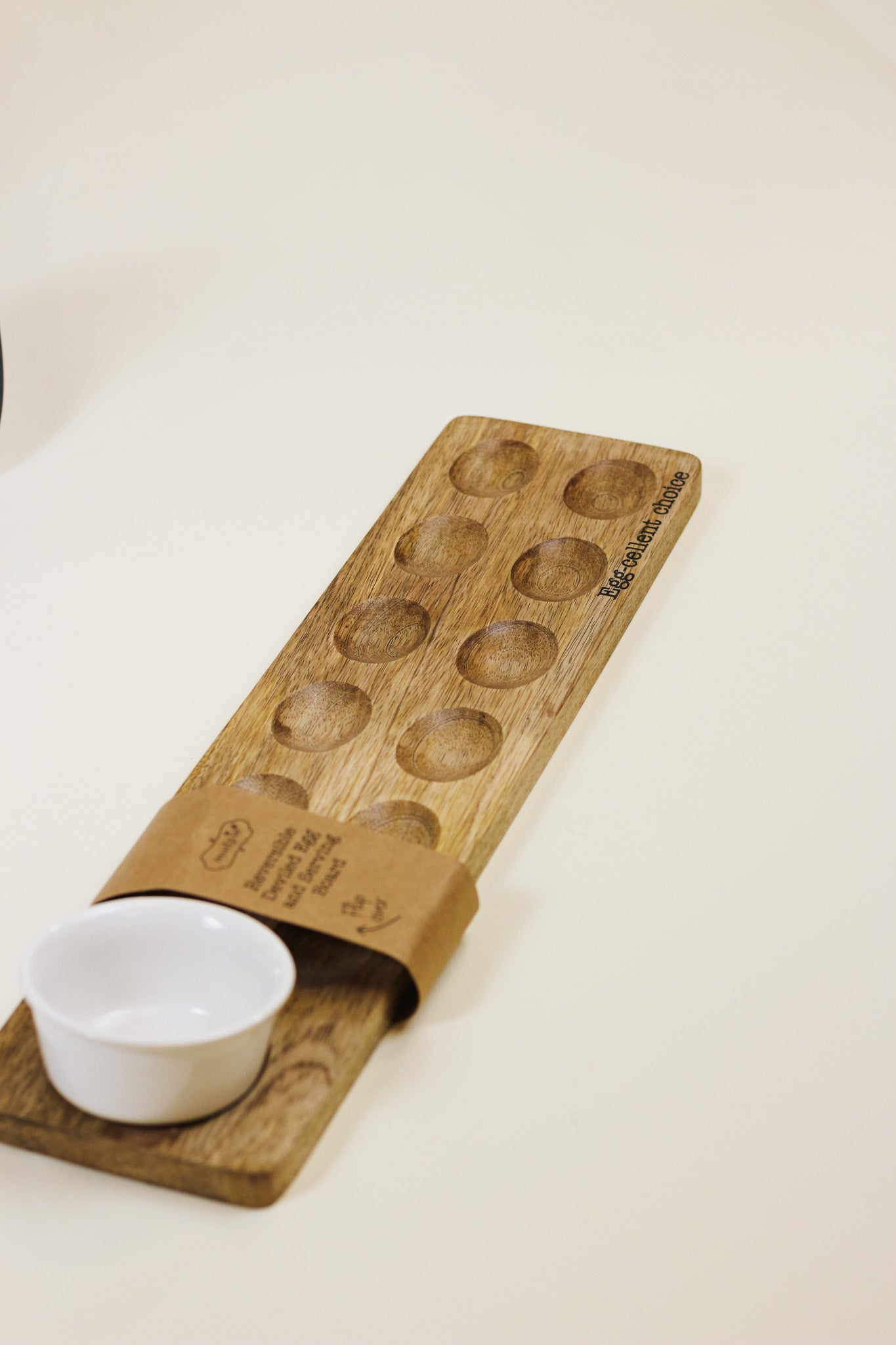 Our Reversible Serving Board Set is the one-stop shop for Appetizers. The mango wood serving board features a removable ceramic dip bowl. The solid board side also reverses to a deviled egg tray with places for 12 eggs. The tray features the sentiments "Egg-cellent choice" and "Little bites".