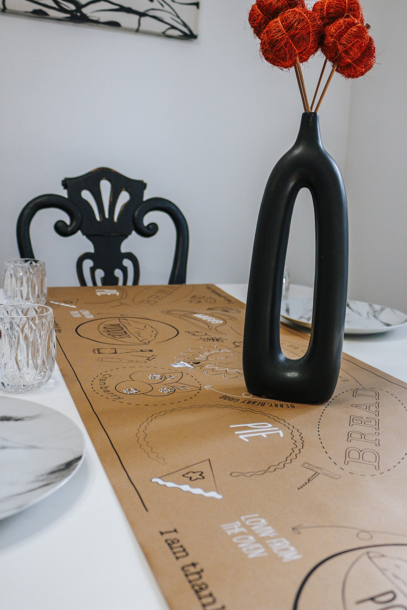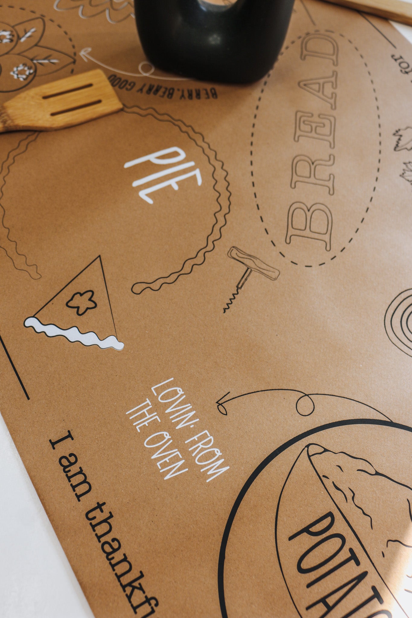 Our Thanksgiving Kraft Table Runner is berry, berry good. The disposable 30 ft. Kraft paper table runner comes rolled. The table runner features places for different thanksgiving dishes like potatoes, pie, bread, turkey and more. The Kraft paper also features detailed images of Turkeys, pumpkins and leaves.