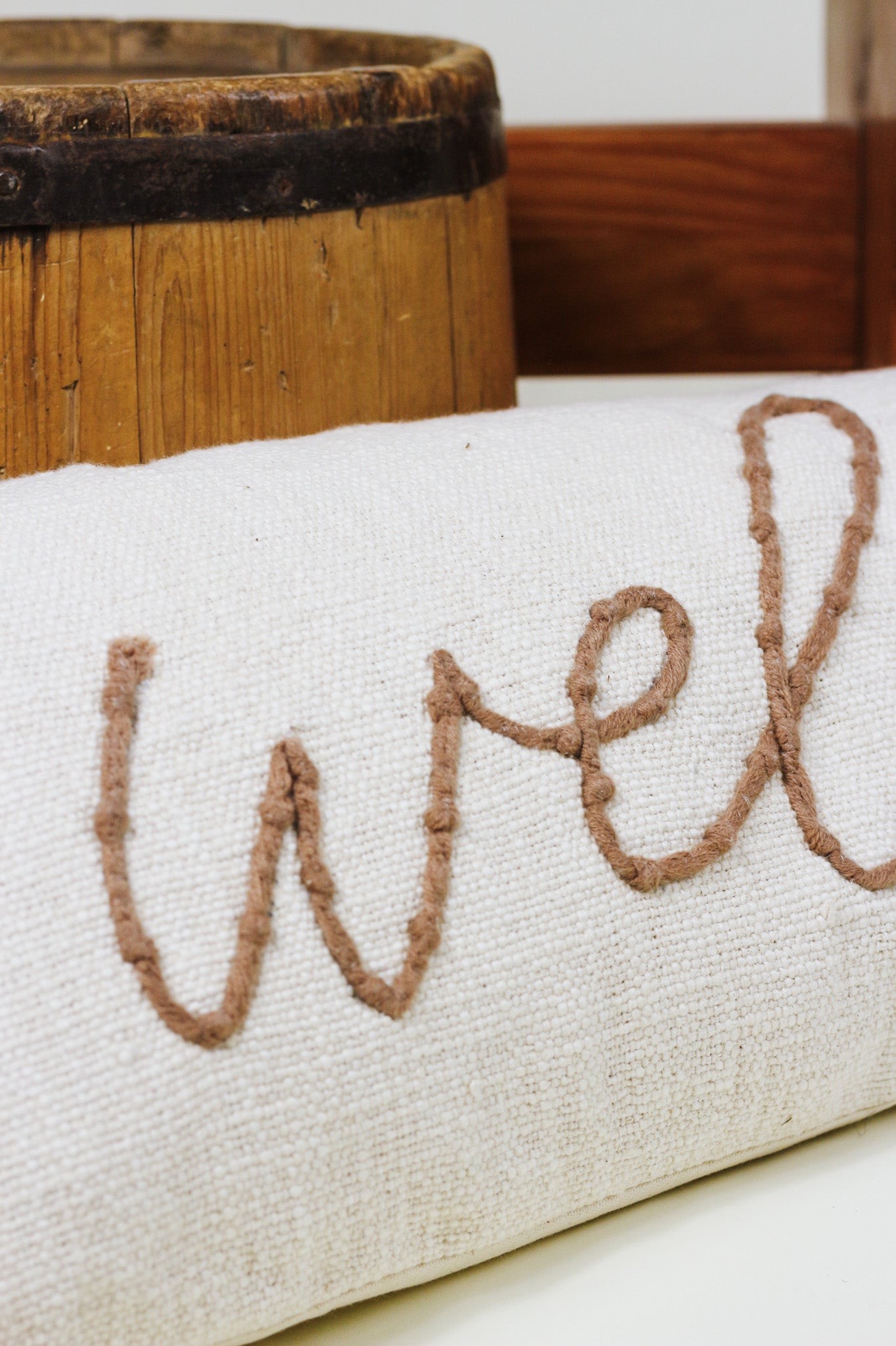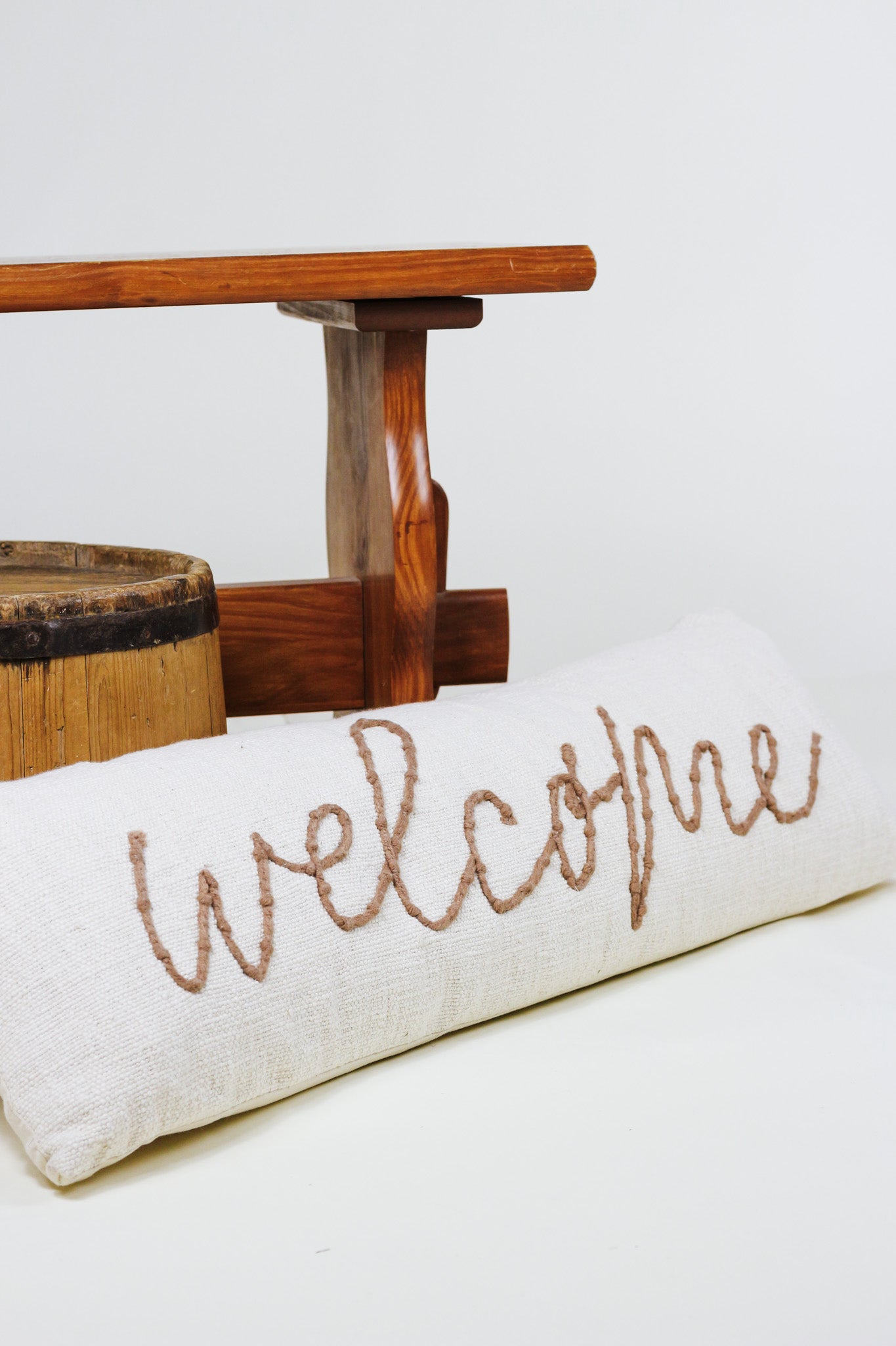 Welcome guests in your home with our Welcome Throw Pillow. The embroidered cotton pillow with canvas backing. The pillow has a zipper closure. The pillow arrives with an insert that is vacuum-sealed and located inside the pillow cover