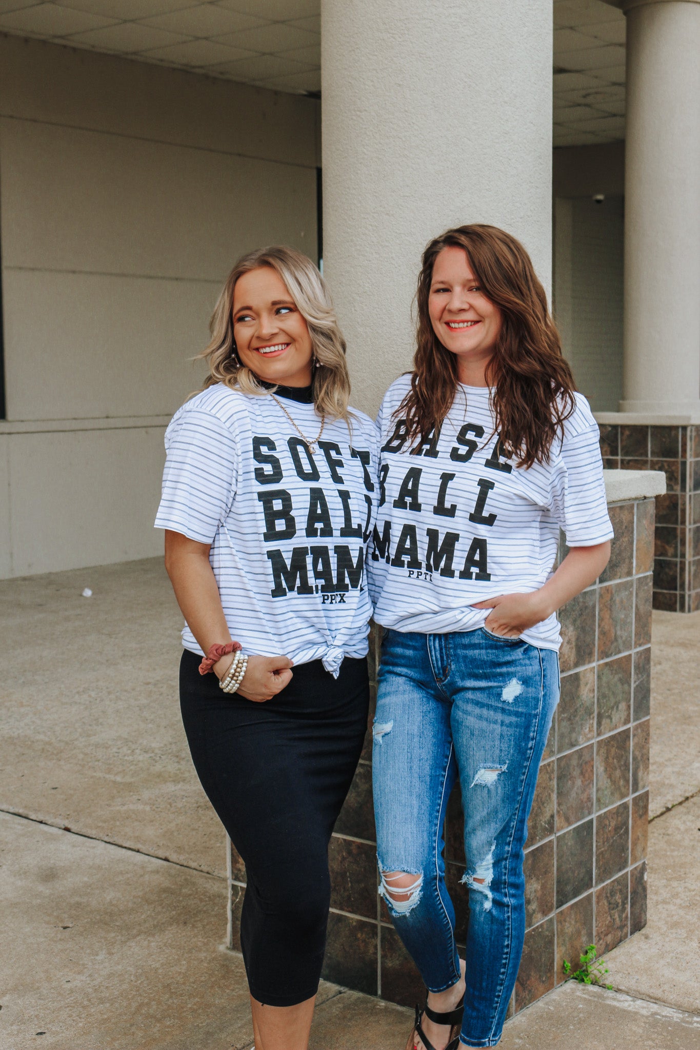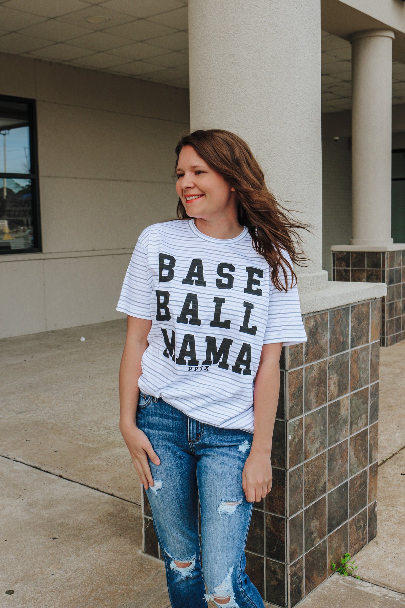 Step up your #momlife game with our Baseball Mama White Stripe Graphic Tee! This stylish and comfortable tee is perfect for cheering on your little slugger at the game. Show off your love for both baseball and motherhood with this must-have wardrobe addition.