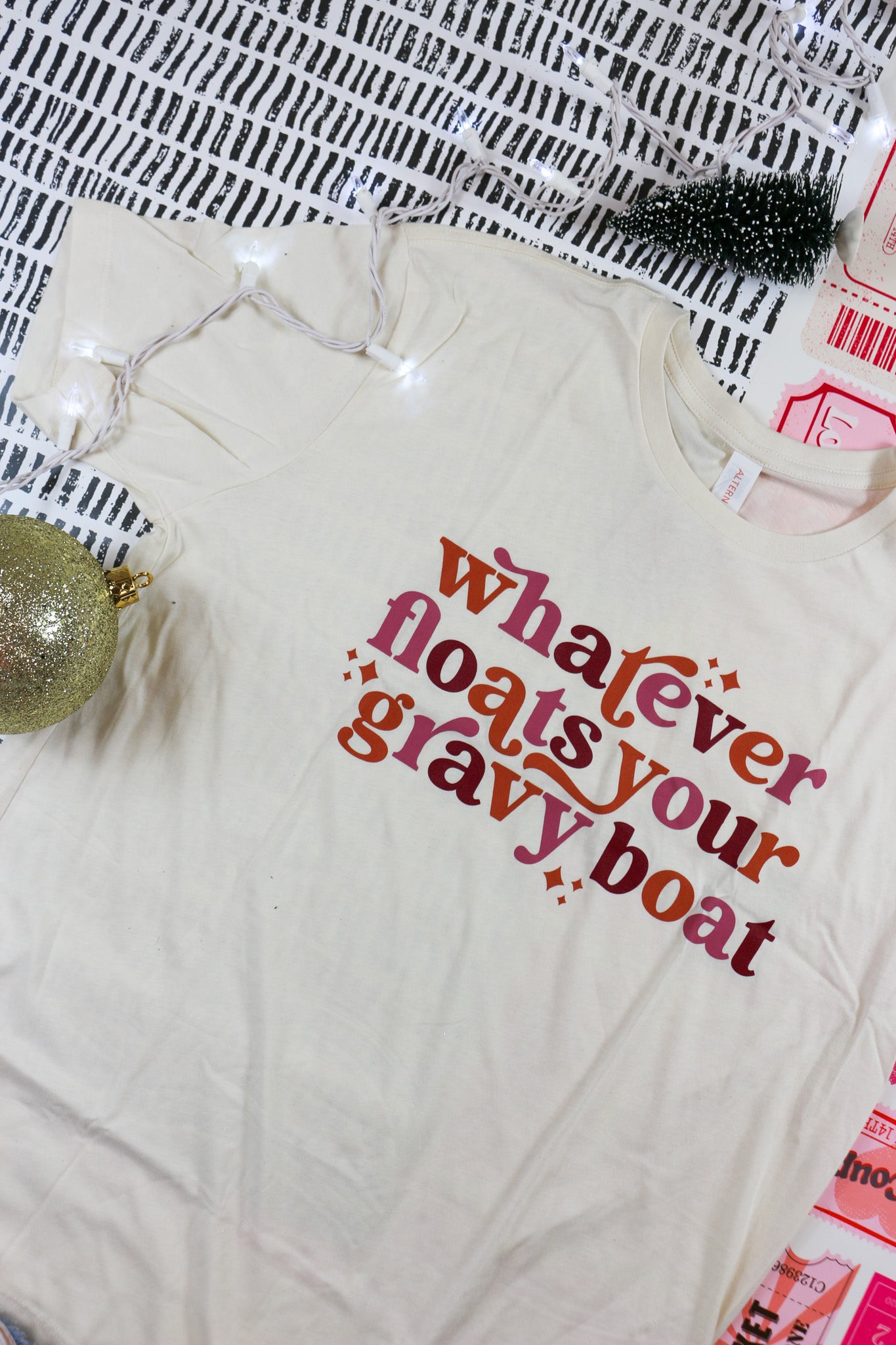 Float through life and add some humor to your wardrobe with our "Floats Your Gravy Boat" cream graphic tee. Keep it casual and comfortable with this unique and playful design. Perfect for any occasion, this tee will surely bring a smile to your face and those around you.