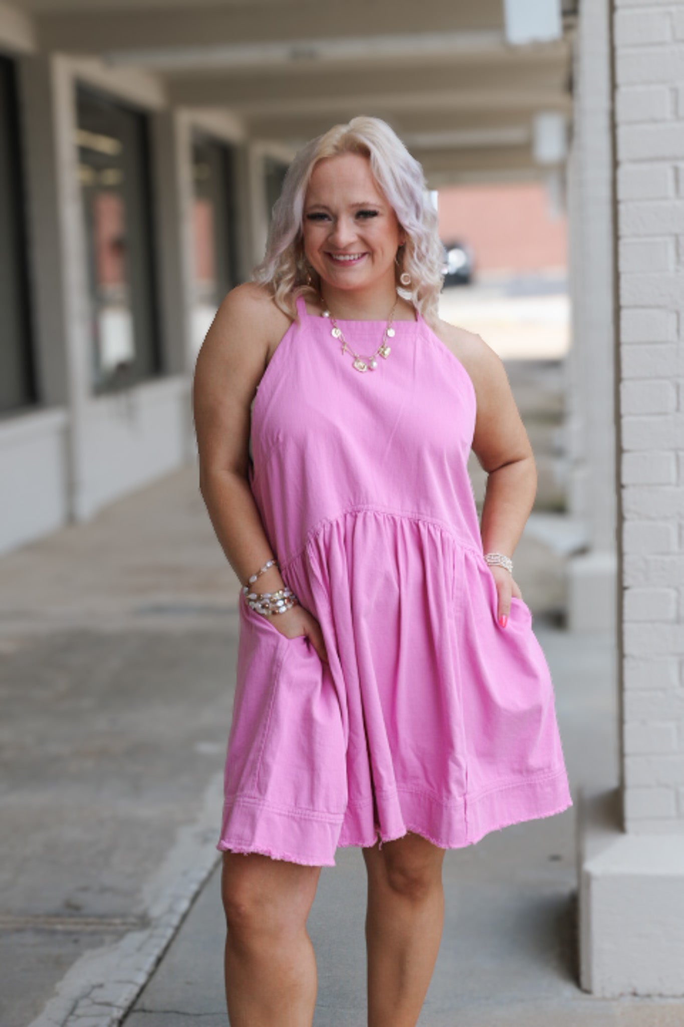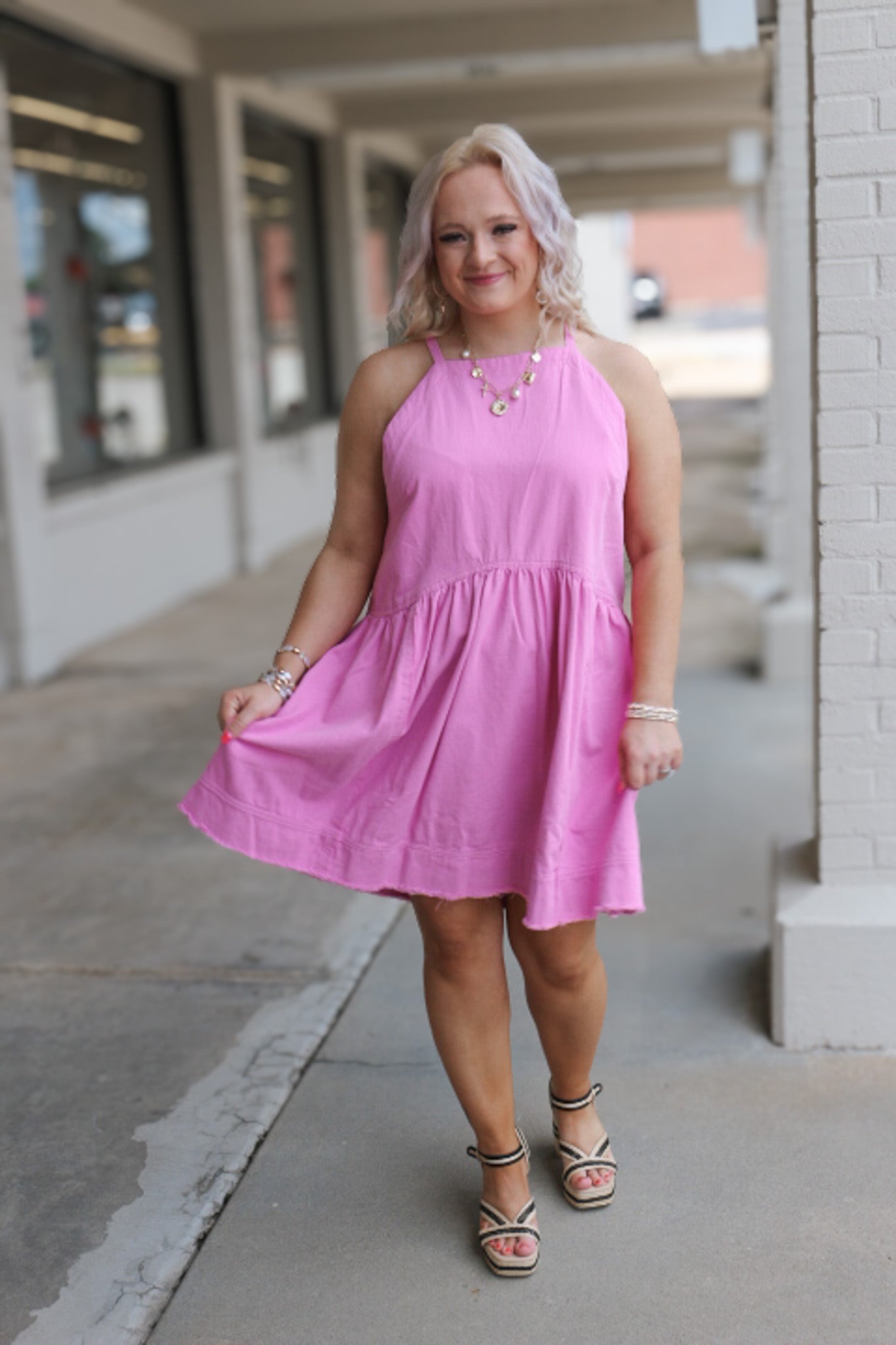 This eye-catching pink denim dress combines playful charm with versatile style. The vibrant candy-pink hue instantly elevates your wardrobe, while the durable denim construction ensures all-day comfort and longevity. Perfect for casual outings or dressed up with accessories for special occasions. Even has pockets!