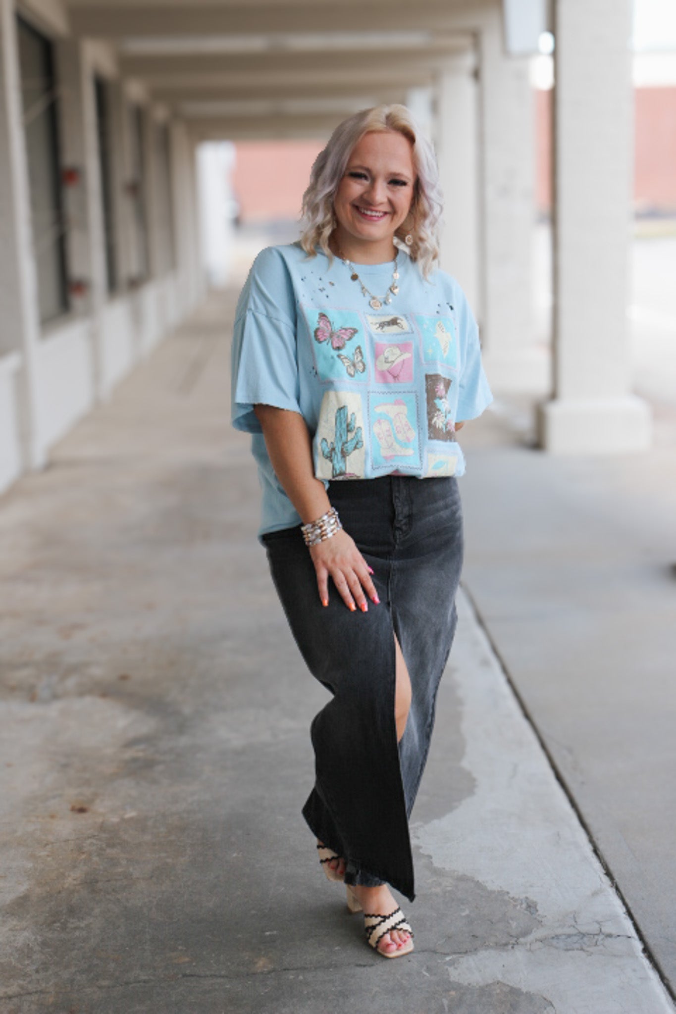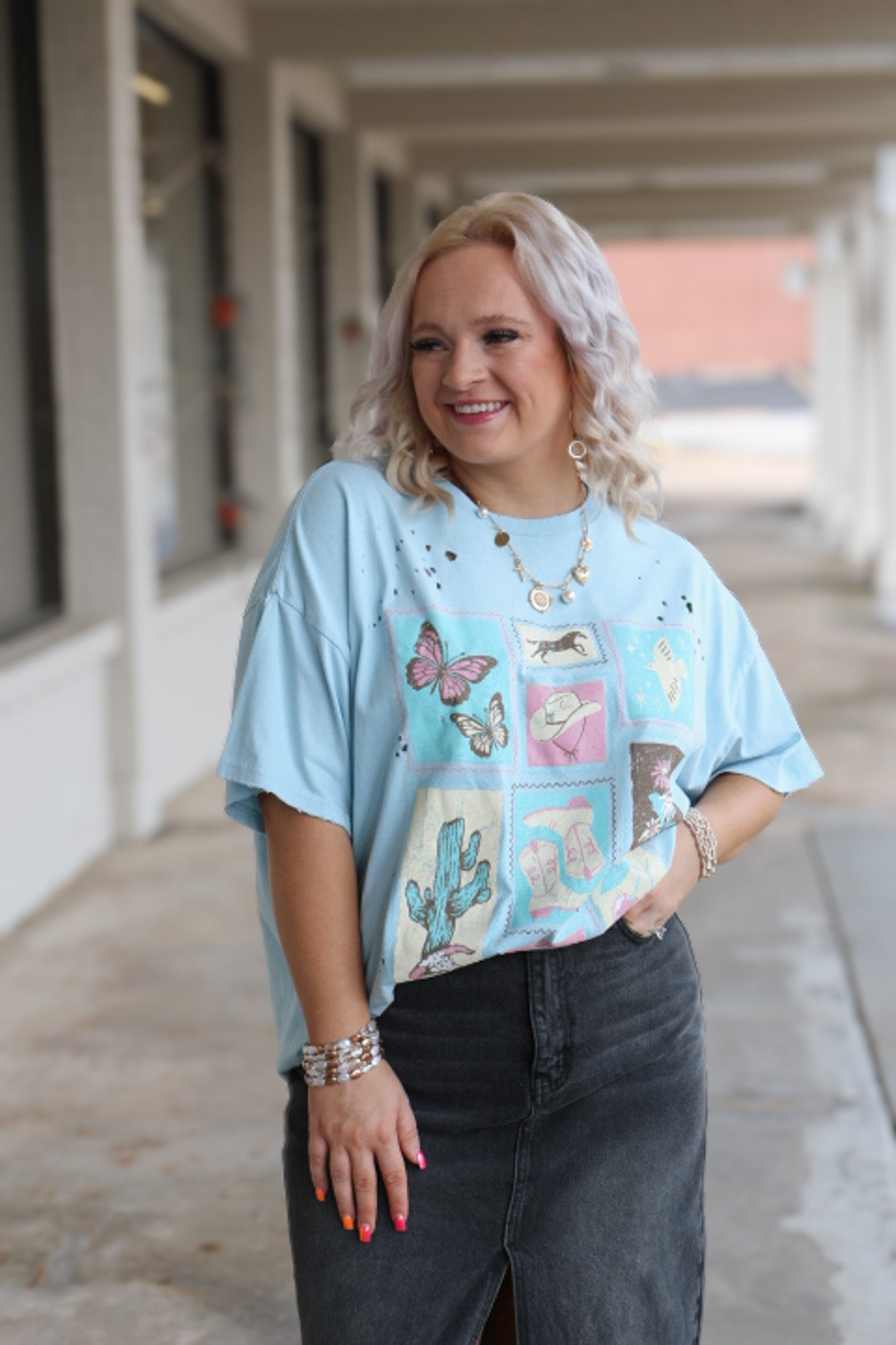 Make a statement in our Western Stamps Light Blue Oversized Graphic Tee. This eye-catching tee combines comfort with bold western-inspired graphics for a look that demands attention. Pair with your favorite jeans for an instantly elevated casual outfit that stands out from the crowd.