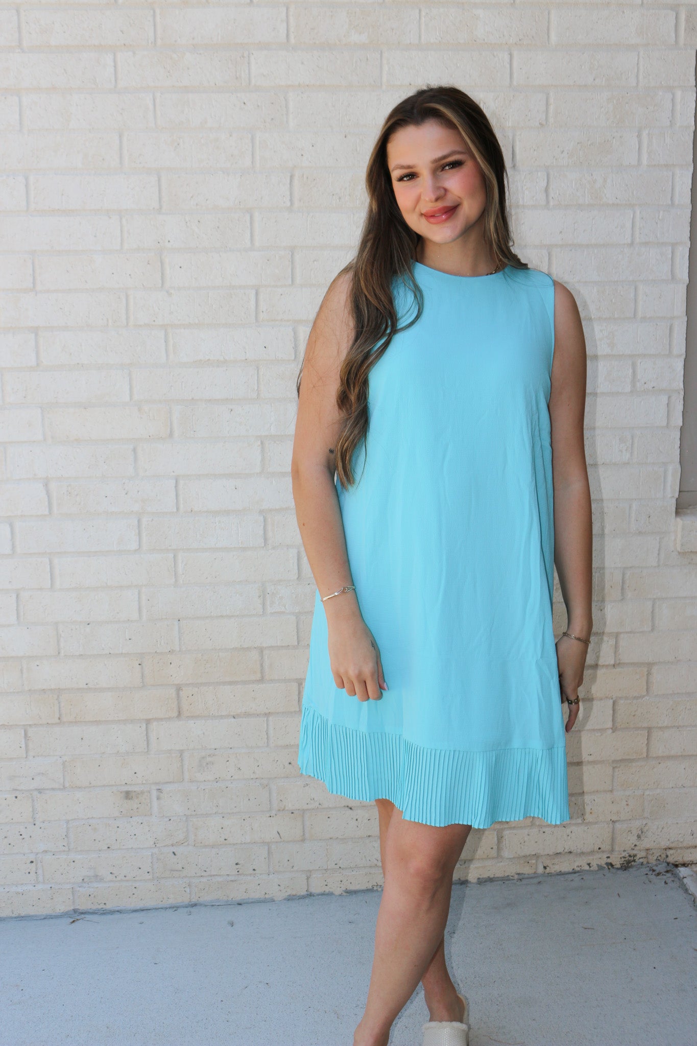 Walks On The Shore Aqua Blue Pleated Dress
