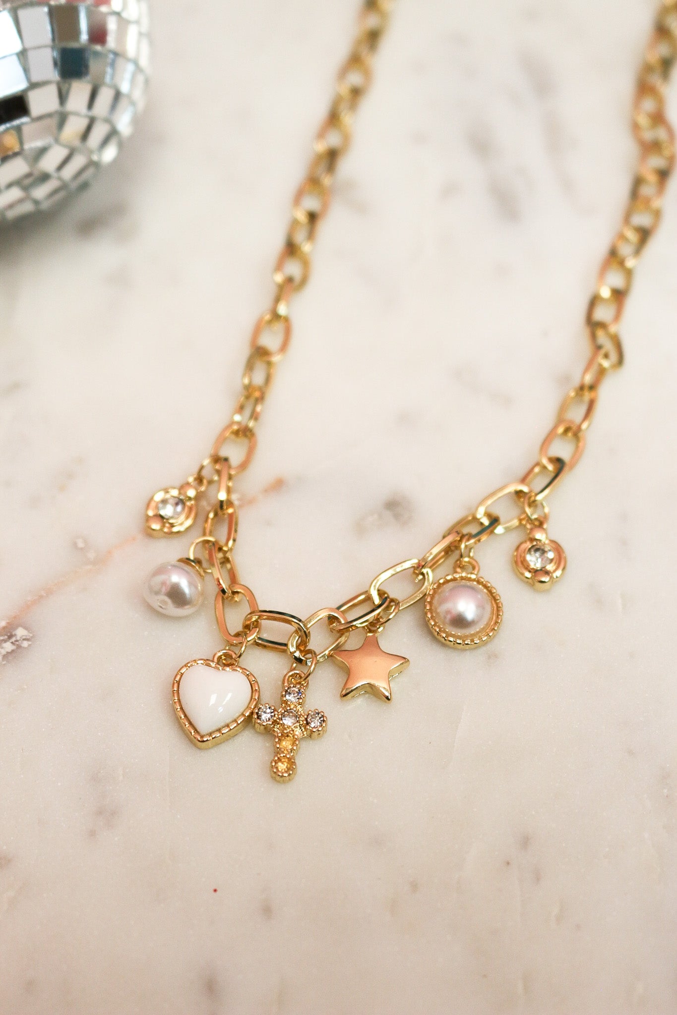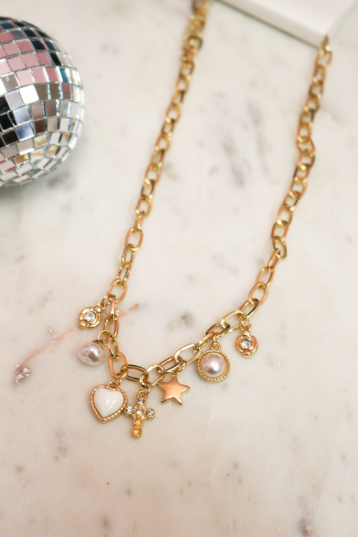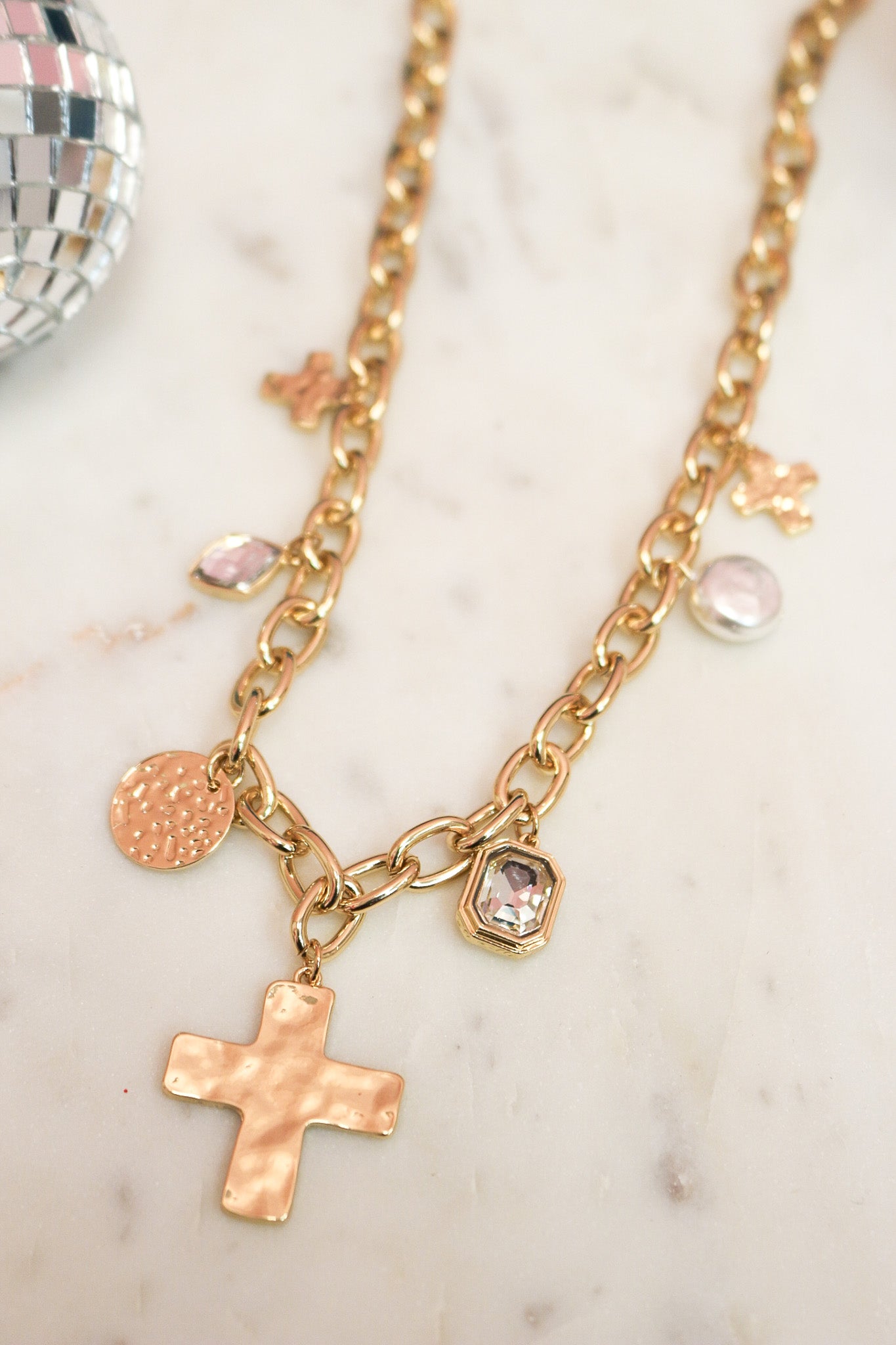 Gold Chain Cross Multi Charm 16"-18" Necklace