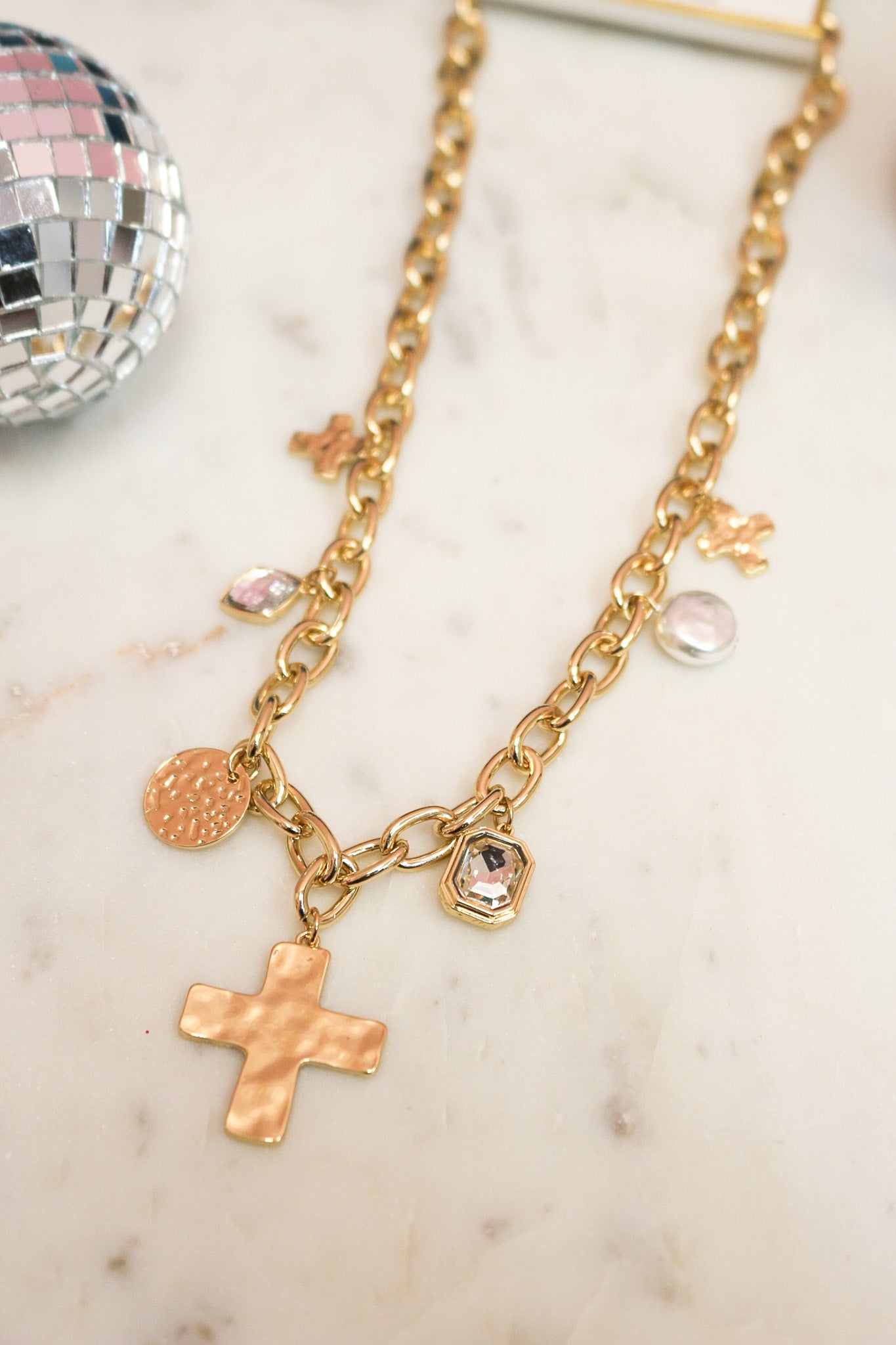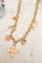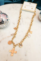 Layer on the charm with this adjustable gold chain necklace featuring a delicate cross pendant surrounded by playful multi-charm accents. The water-resistant design keeps your look fresh through daily adventures, while the 16"-18" adjustable length ensures the perfect fit for any neckline. Mix it solo for understated elegance or stack it with other pieces to create your own signature style. A versatile essential that transitions effortlessly from casual to dressed-up moments.