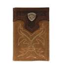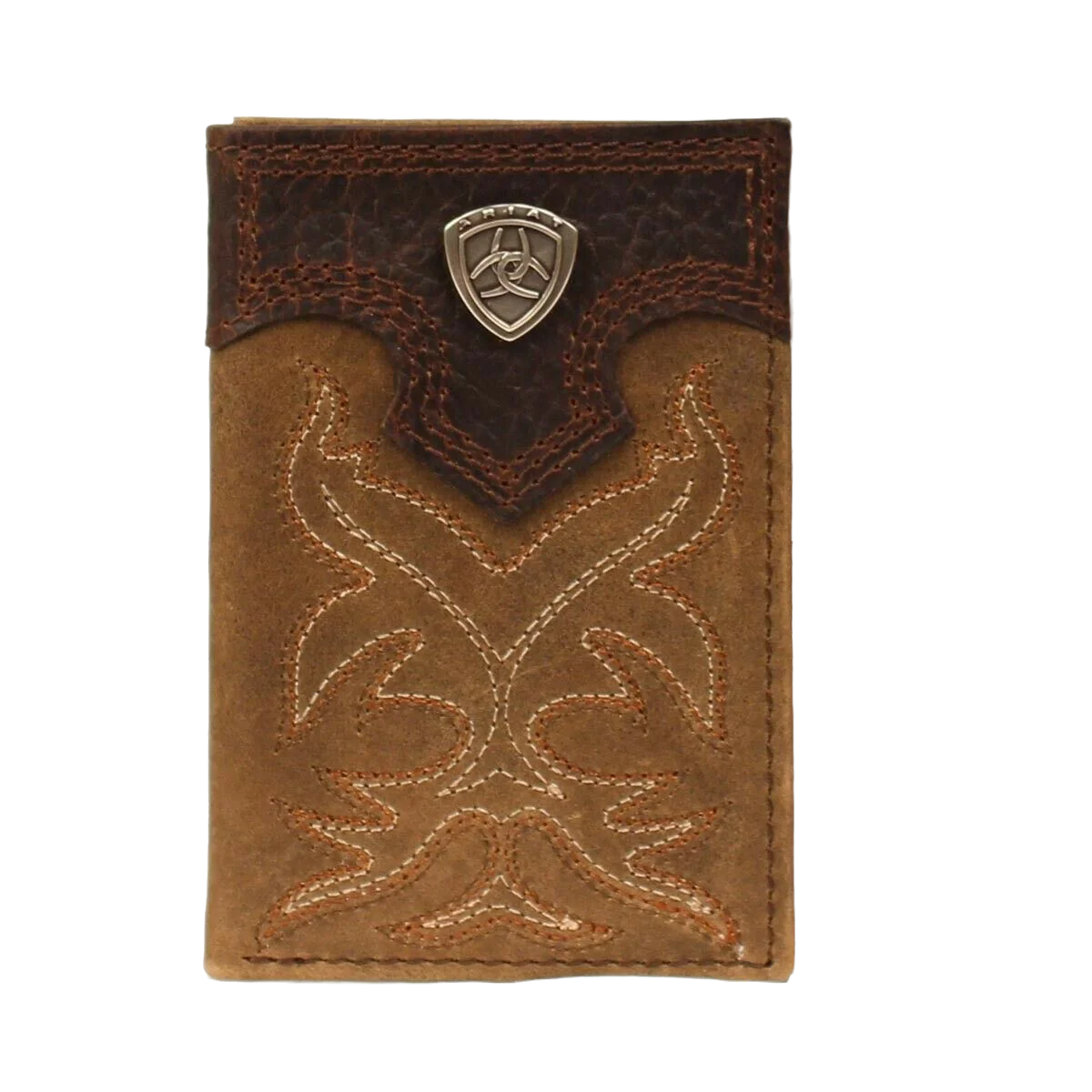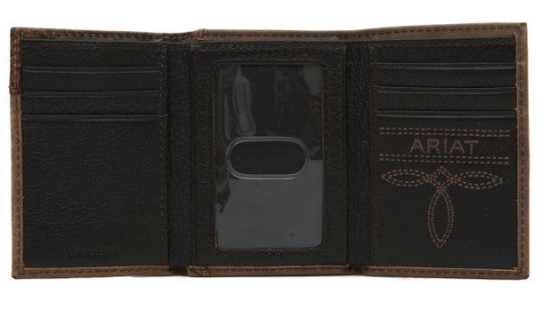 You will love this Ariat trifold wallet by M&F Western Products. Wallet is distressed brown leather with Ariat shield concho. Multicolorple credit card slots, clear drivers license slot and removable picture holder.