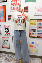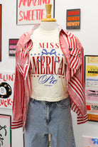 Celebrate iconic Americana with this Miss American Pie graphic tee. Featuring a bold, nostalgic design on soft ivory fabric, it's the perfect statement piece for anyone who loves classic Americana vibes. Comfortable everyday wear that pairs effortlessly with jeans, shorts, or your favorite bottoms. A wardrobe essential that brings retro charm to your casual style.