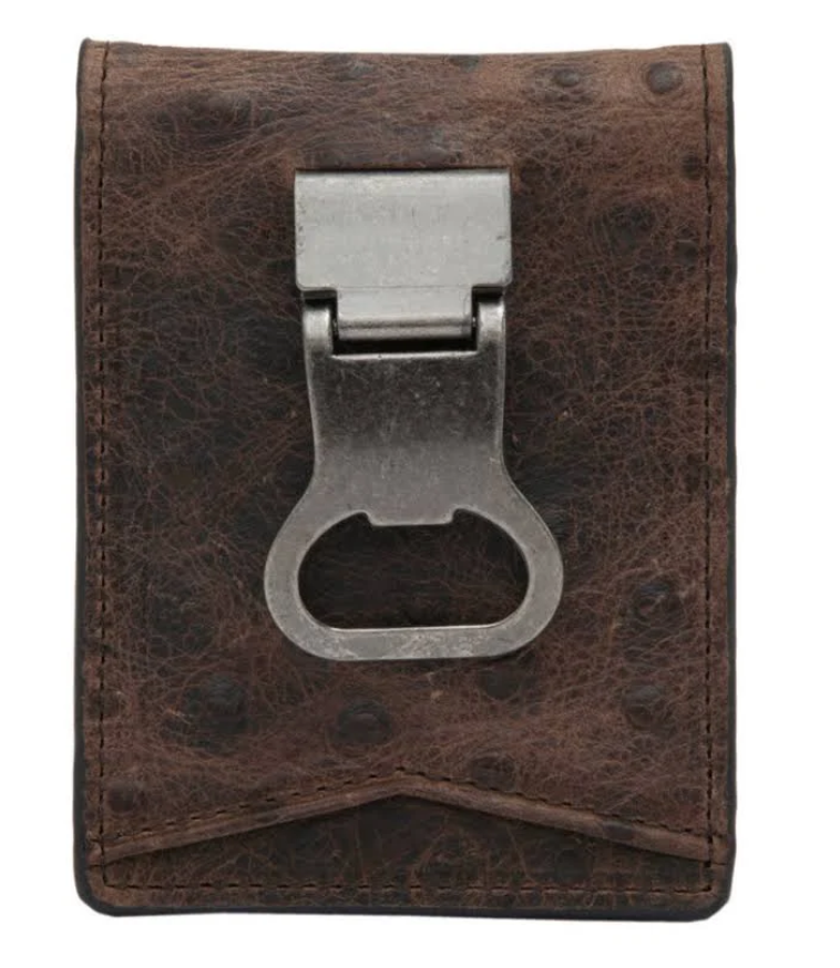 This DBL Barrel bi-fold money clip features brown distressed leather and a bottle cap money clip on the front. This wallet also has a clear ID holder, credit card slots and a cash divider to keep you organized.