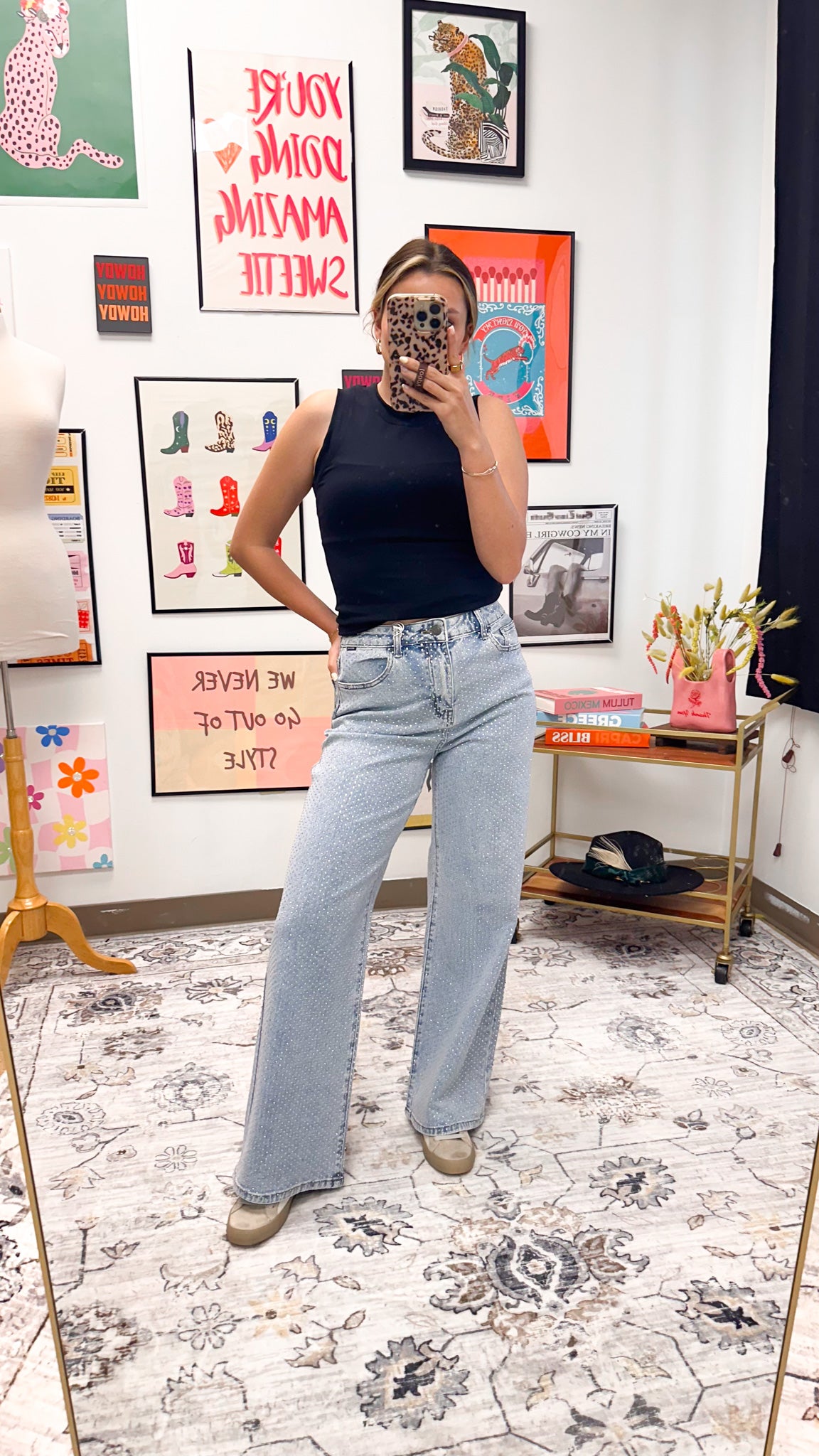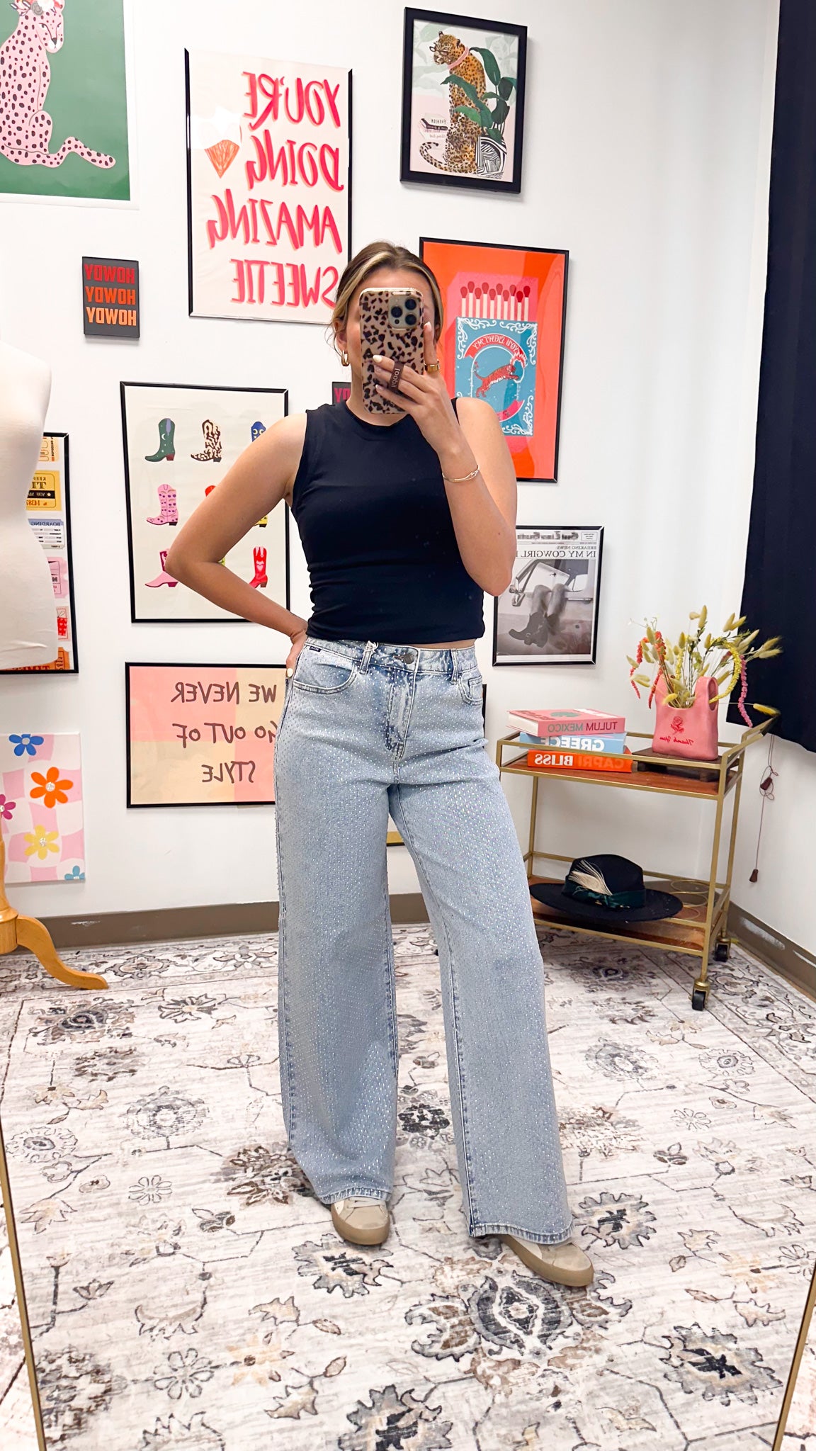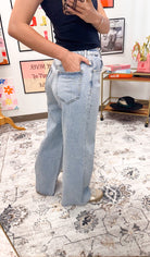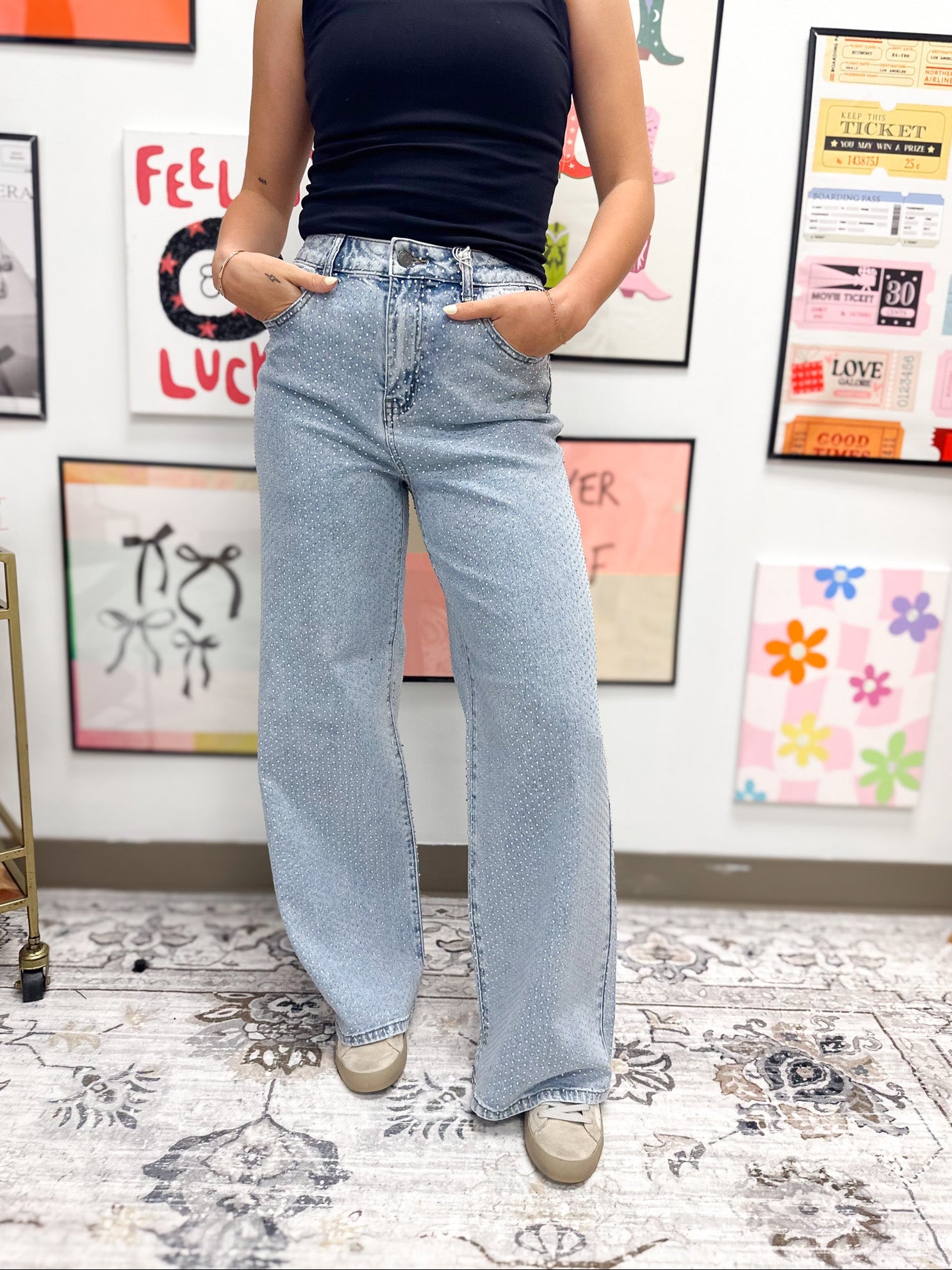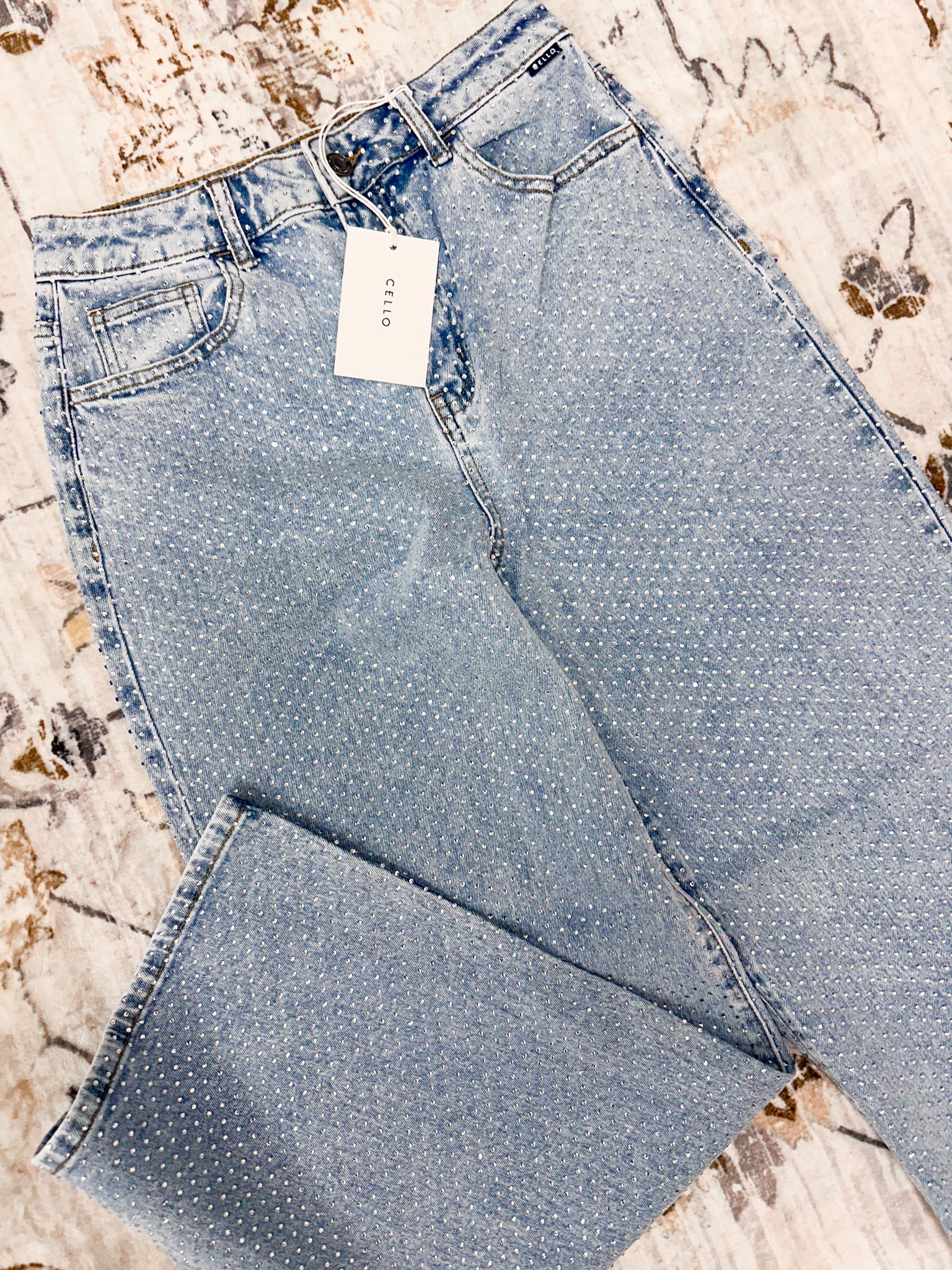 Make a statement with these eye-catching Rhinestone High Rise Wide Leg Jeans. Featuring a flattering high-rise cut and relaxed wide-leg silhouette, these jeans are adorned with sparkling rhinestones throughout for an elevated, glamorous look. Perfect for standing out at any occasion, whether you're dressing up for a night out or adding sparkle to your everyday style. The classic denim construction ensures comfort and durability, while the rhinestone embellishments add that extra touch of shine and sophistication.