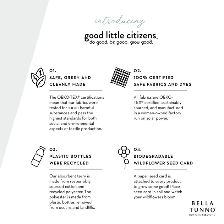 Splish splash! This set includes everything you need for baby’s bath time. Featuring a cozy, ultra-soft hooded towel and coordinating wash mitt. The little ears may not help them listen better, but they sure are cute! Our absorbent terry fabric is made of OEKO-TEX® certified and sustainably sourced cotton and a recycled polyester that keeps 8 plastic bottles out of landfills.