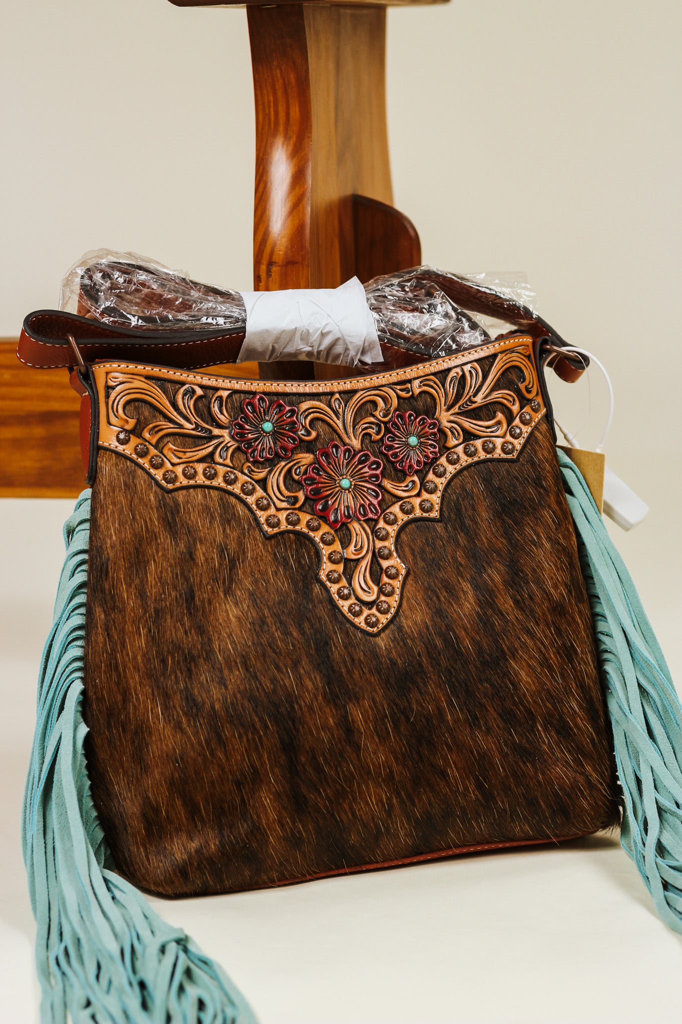 Ariat Lorelei crossbody bag by M&F Western Products. Tan genuine leather with calf hair on the front and back of the bag. Turquoise fringe on the sides and a tooled floral cut out patch on the front of the bag with red flowers and turquoise stones. Adjustable strap and a zip top closure.