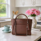 Meet the tote you'll never outgrow - from diaper bag for baby to chic purse for brunch! The Boss Tote is designed to move with you featuring an easy-wipe vegan leather exterior and the option to carry by handles or luxe, chain-detailed shoulder straps. Organization is a total breeze with a spacious main compartment offering multiple interior pockets for your valuables, changing essentials & so much more! Plus, a front pocket for easy access & hook closure to keep everything inside secure. Bonus: includes a coordinating changing pad, stroller straps, and removable tassel! Safe to say, you're going to tote-ally love it!