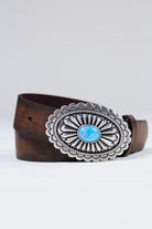 This ladies Ariat belt by M&F Western Products has simple elegance. Beautiful silver buckle with turquoise colored stone in center for an eye-catching look. Perfect belt to wear when you are dressed up or great with your favorite pair of jeans.