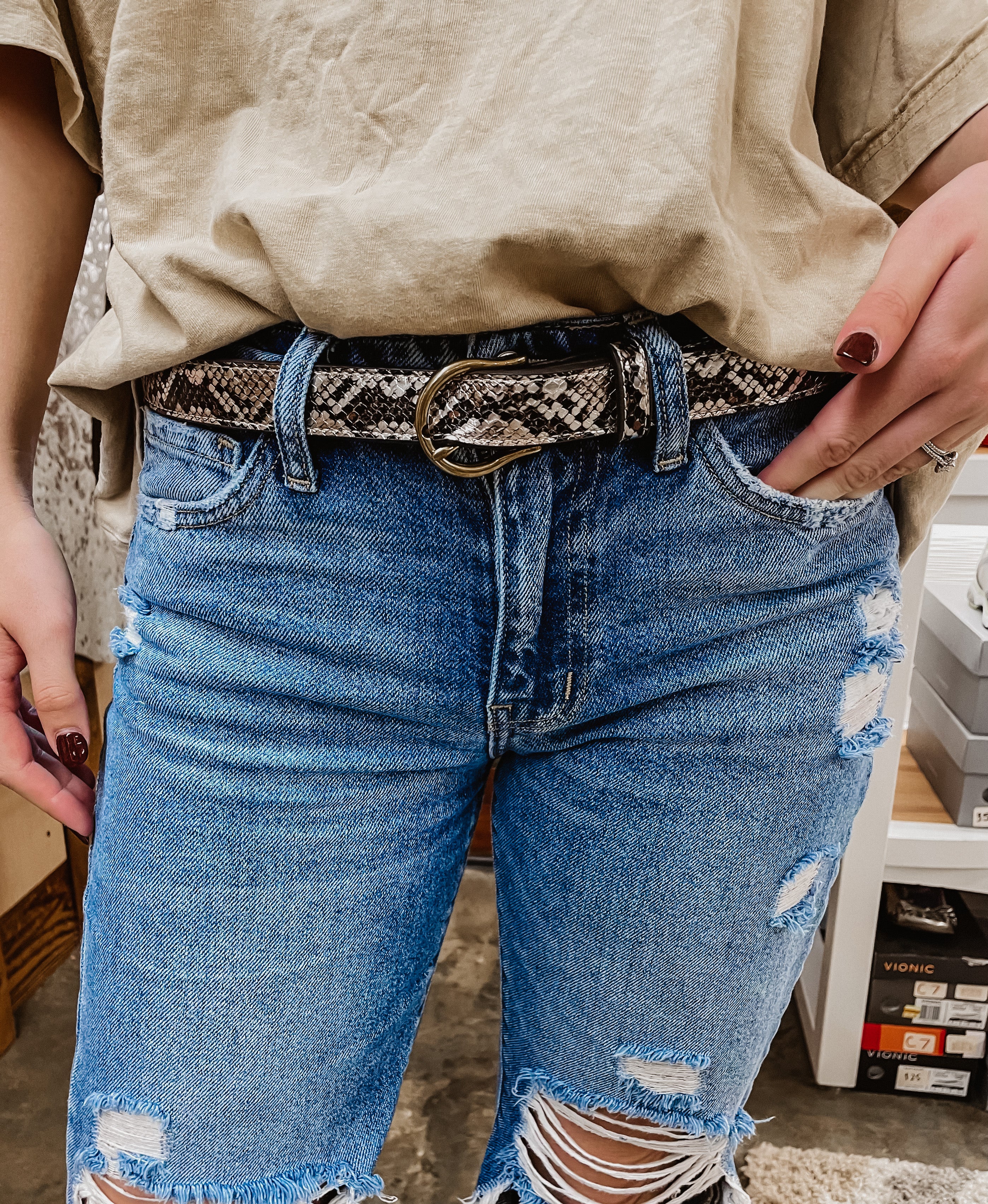 You can't go wrong with adding this belt to your collection. It's super trendy and matches any plain colored top. Adding a belt can really spark up an outfit and dress it up.