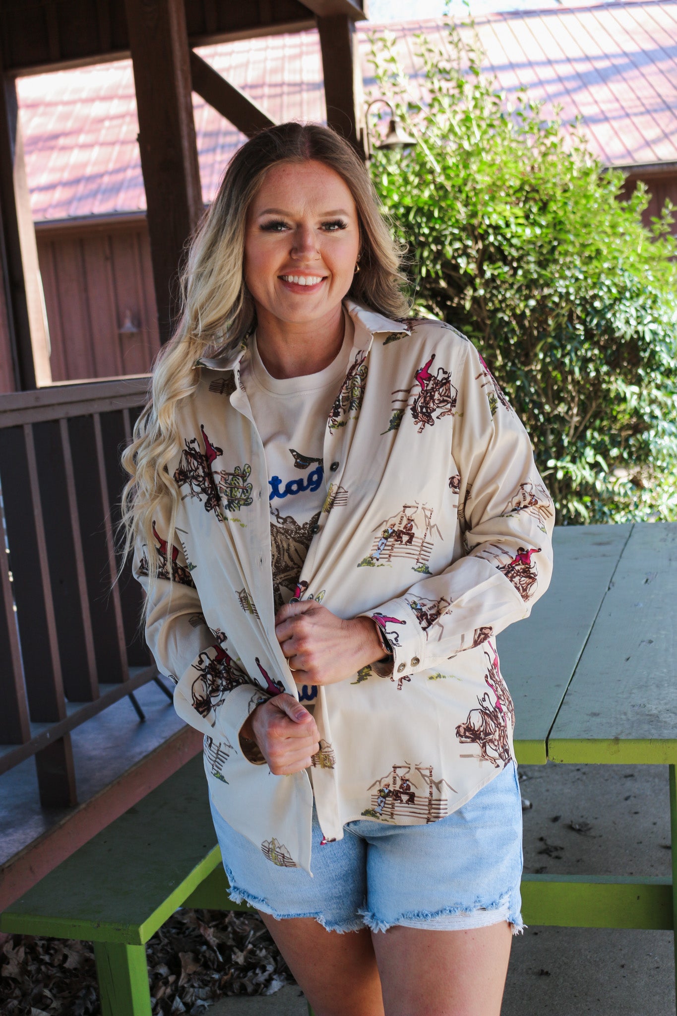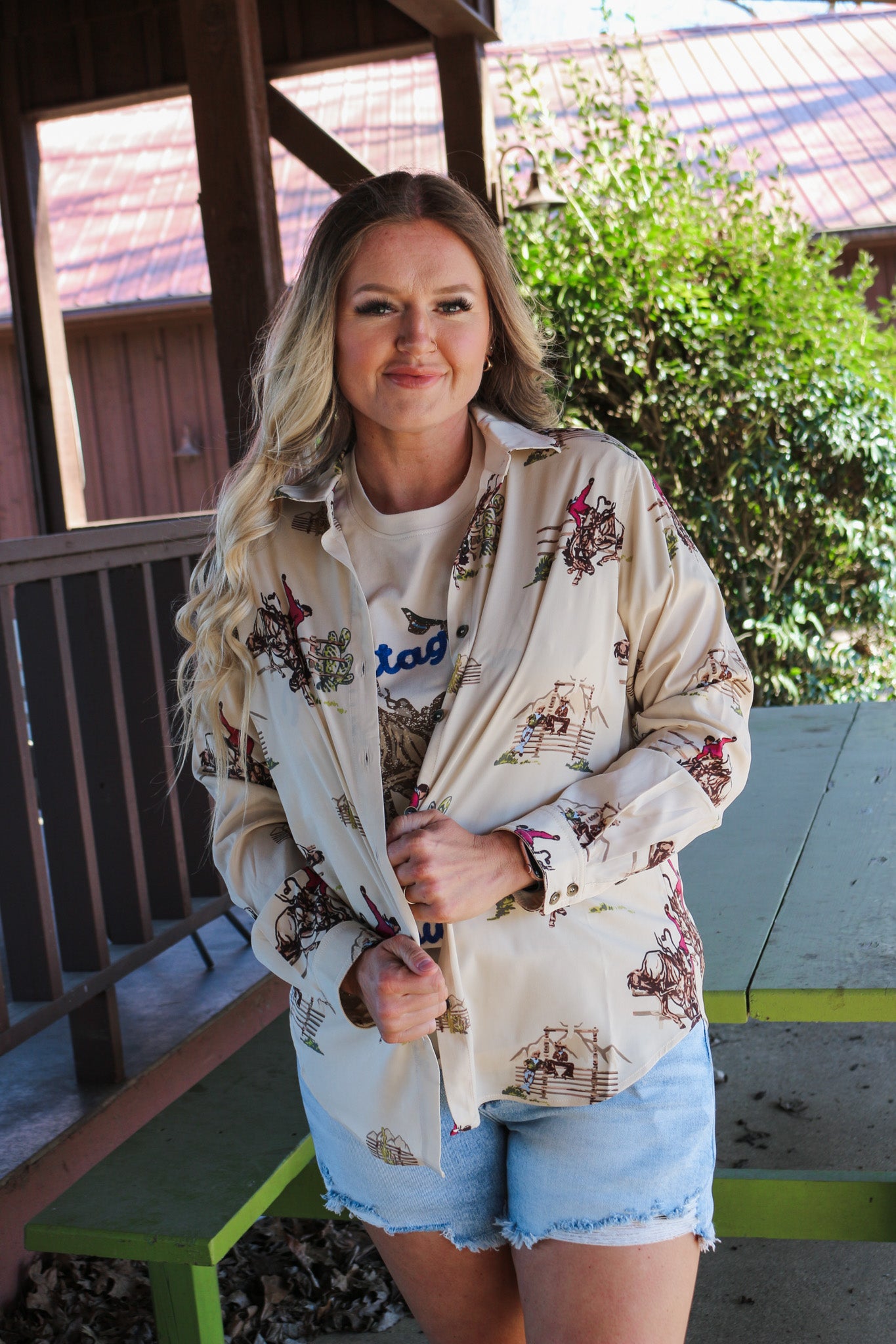 Cream with Round Up Print Long Sleeve Button Down Shirt.