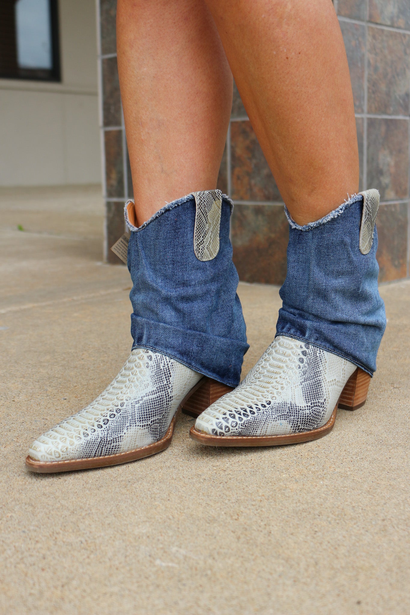 Denim Dream is where bold textures meet effortless style. With a striking snake print foot and a denim cuff overlay, this bootie offers a unique blend of fierce and chic. The sleek silhouette and unexpected design details make it the perfect statement piece for anyone looking to add a touch of edge to their look. Denim Dream is made to turn heads, one step at a time.