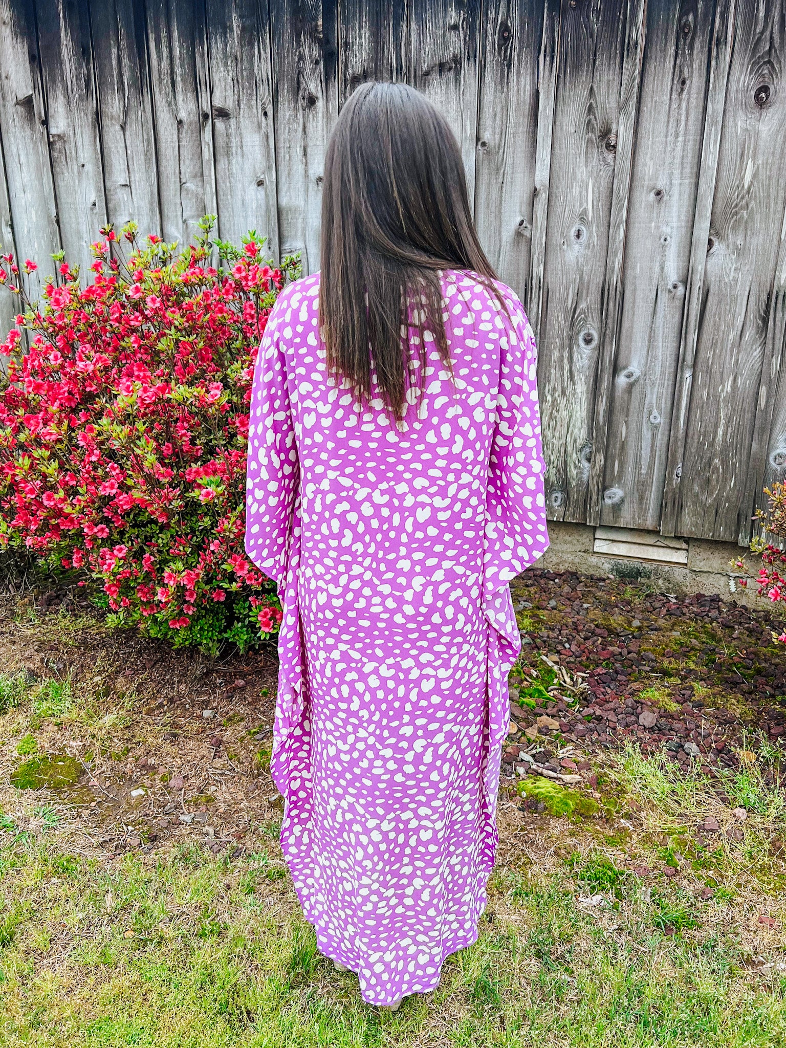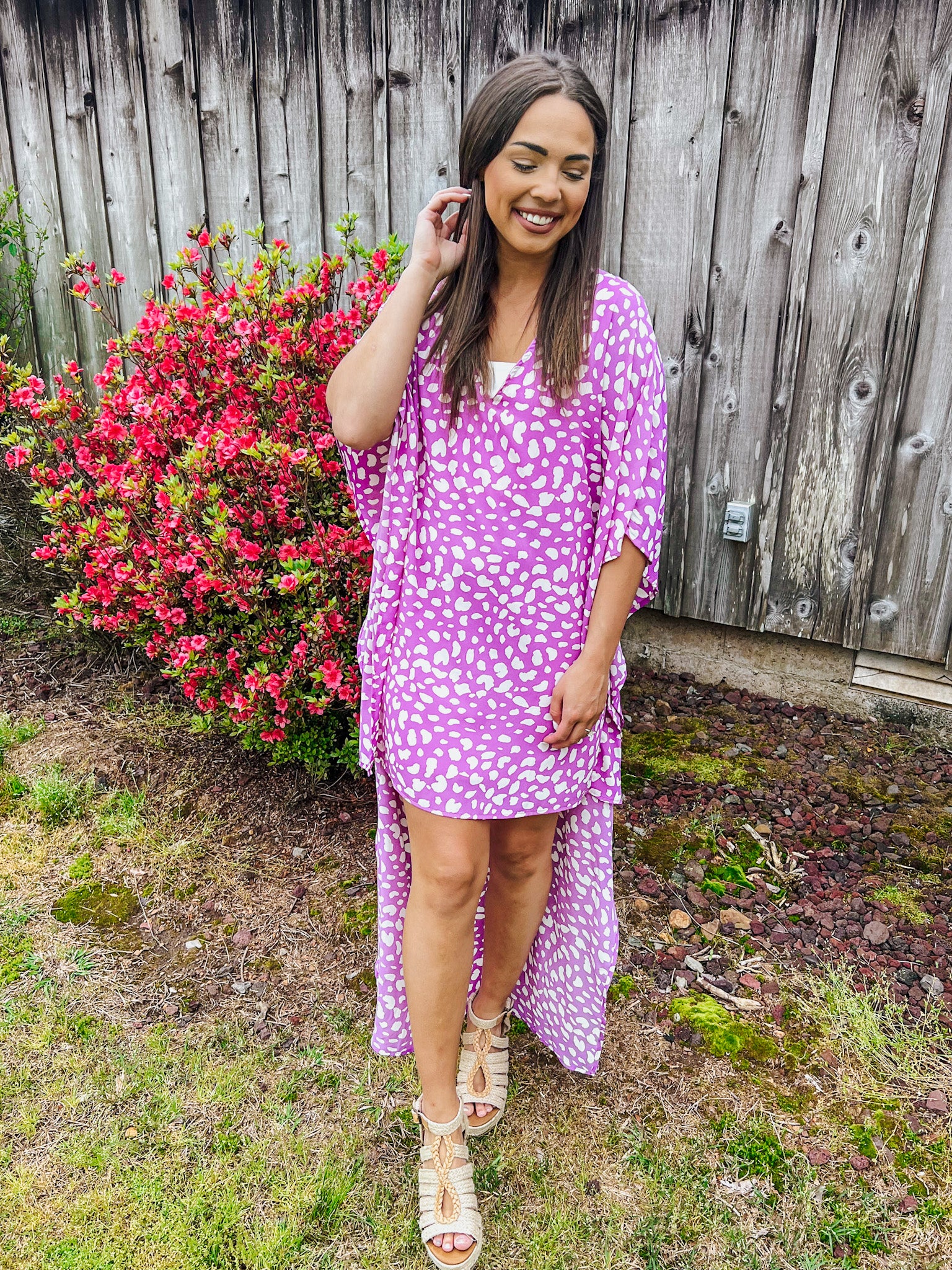 Talk about fashionably unique! This dress will turn heads with its bright color and high-low fit. It's a sheer light weight material with a loose fit. It has short sleeves and comes down longer in the back. The spotted print gives it that trendy, modern look.