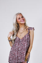This tank is one of a kind with the unique ruffled sleeves. The bright red leopard print gives it some character! Pair with mom jeans and some plain colored booties for a dressy, relaxed fit.