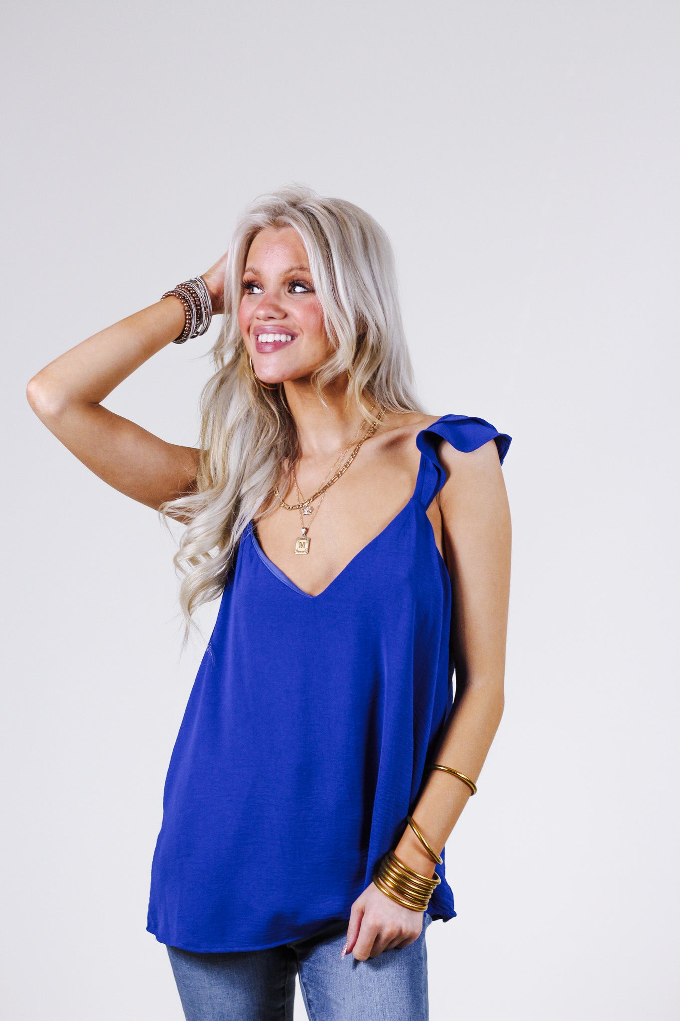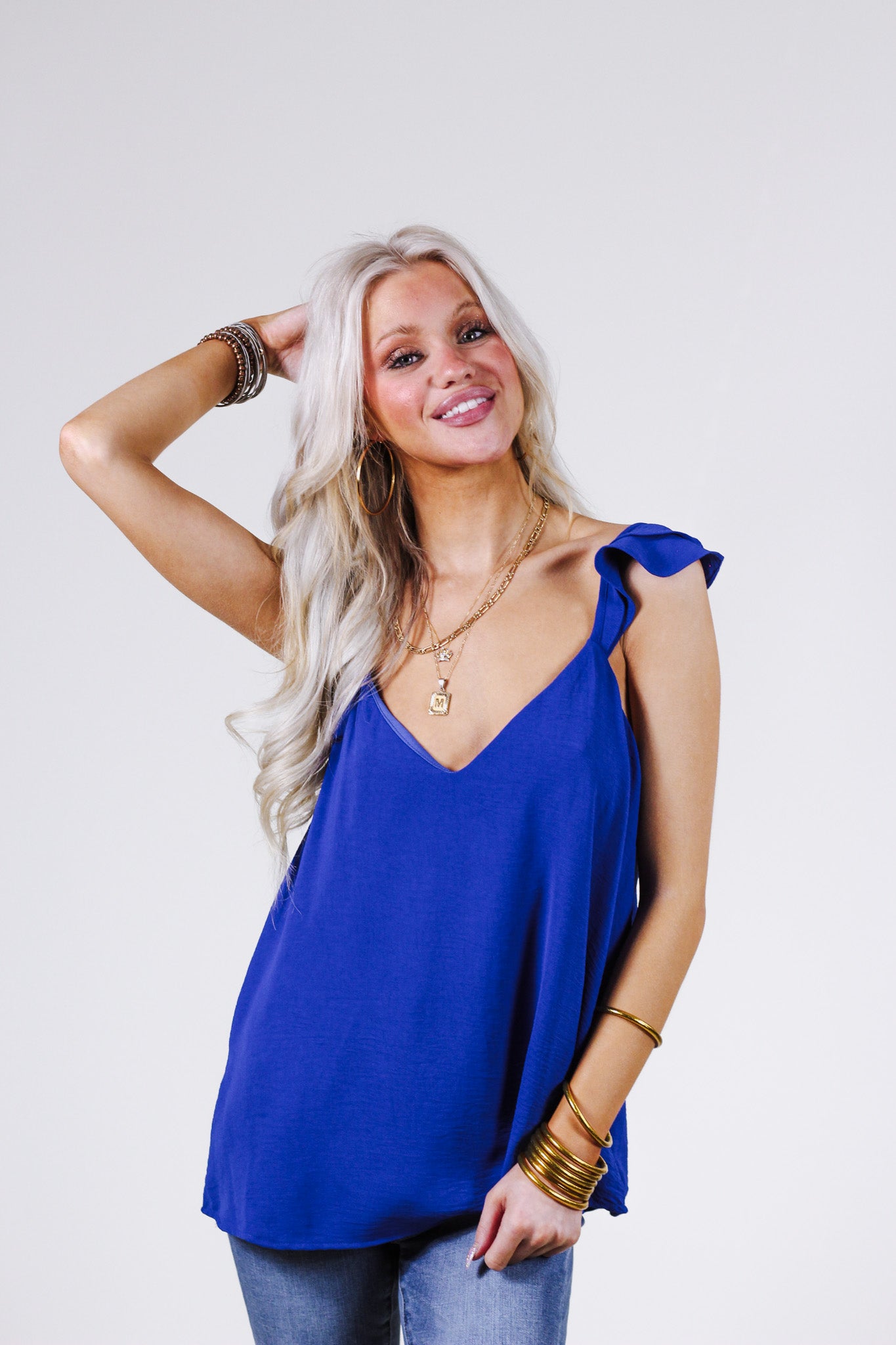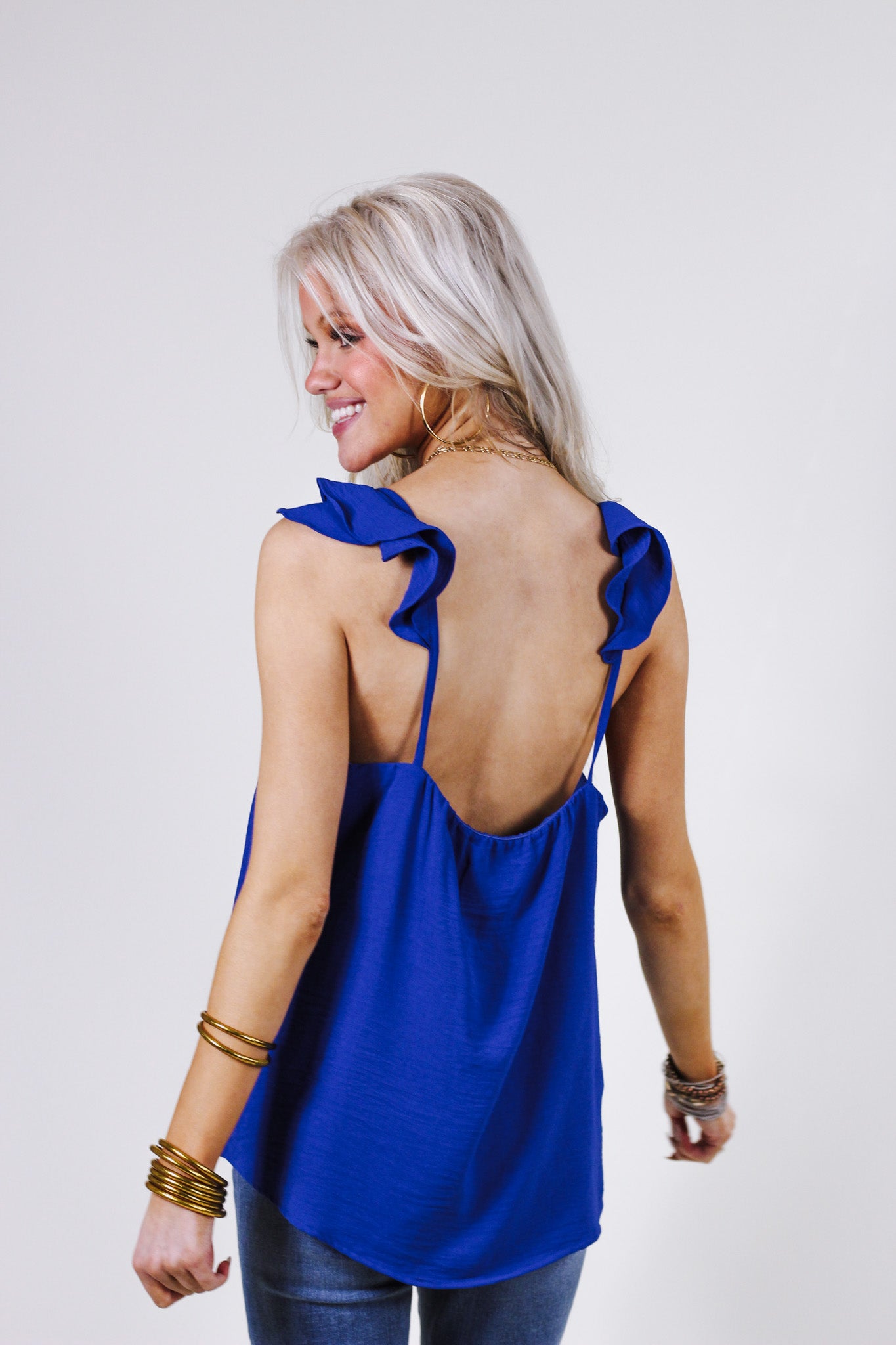 This tank is one of a kind with the unique ruffled sleeves. This blue is super vibrant and plain so spice up your fit with some crazy pattern pants or shoes. Polyester material. Loose fit. TTS.