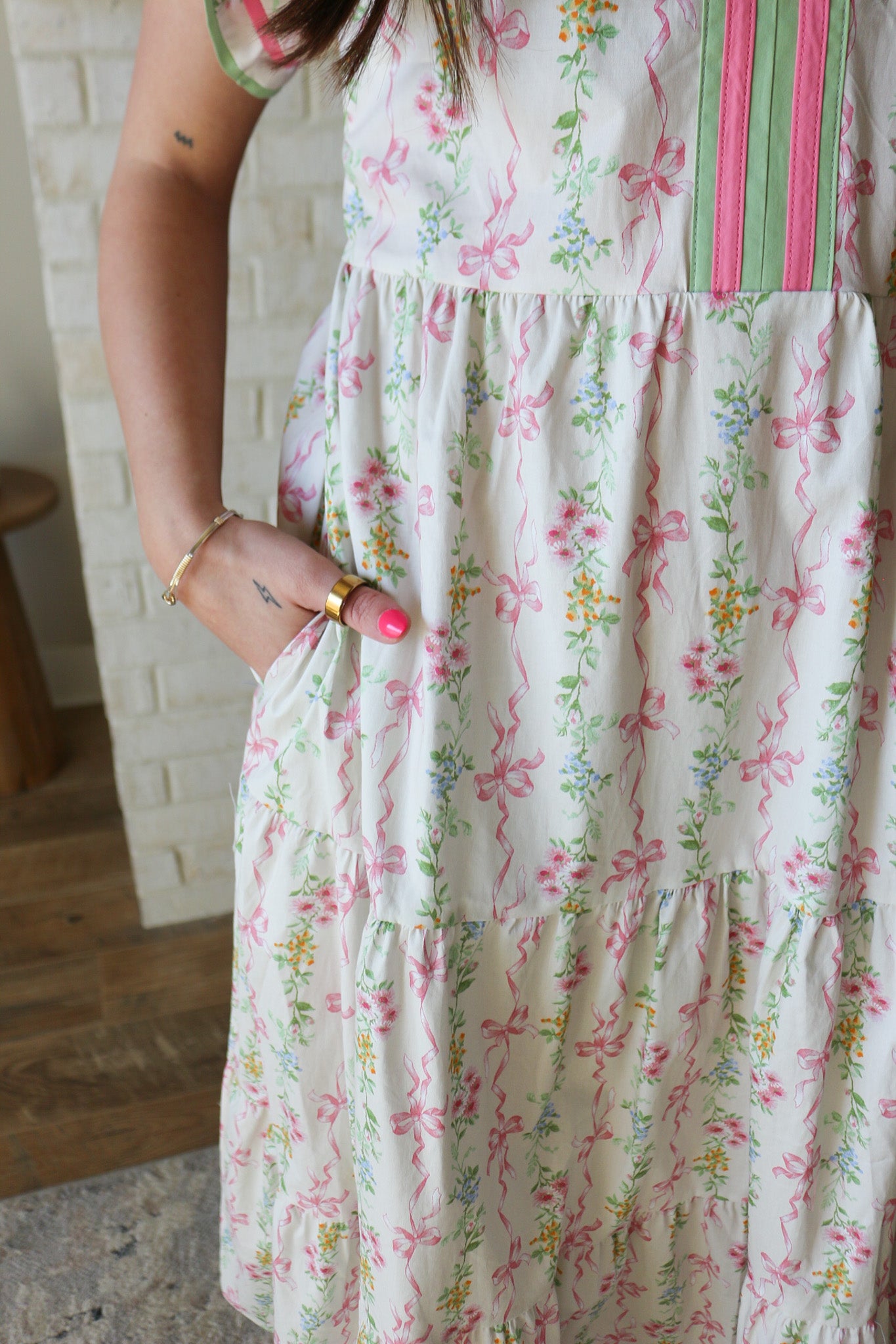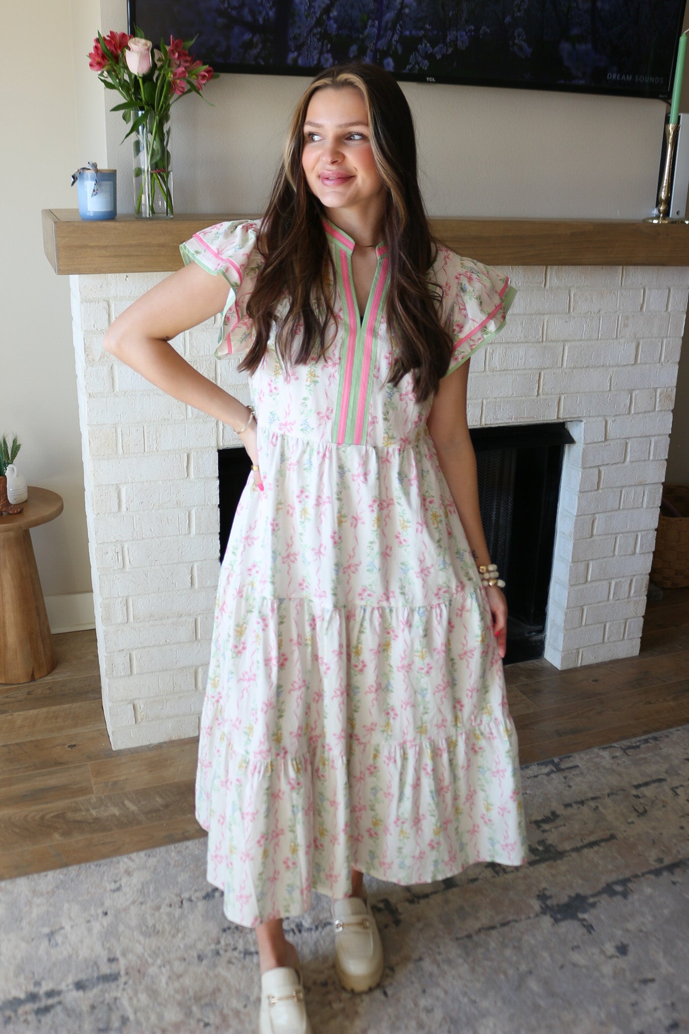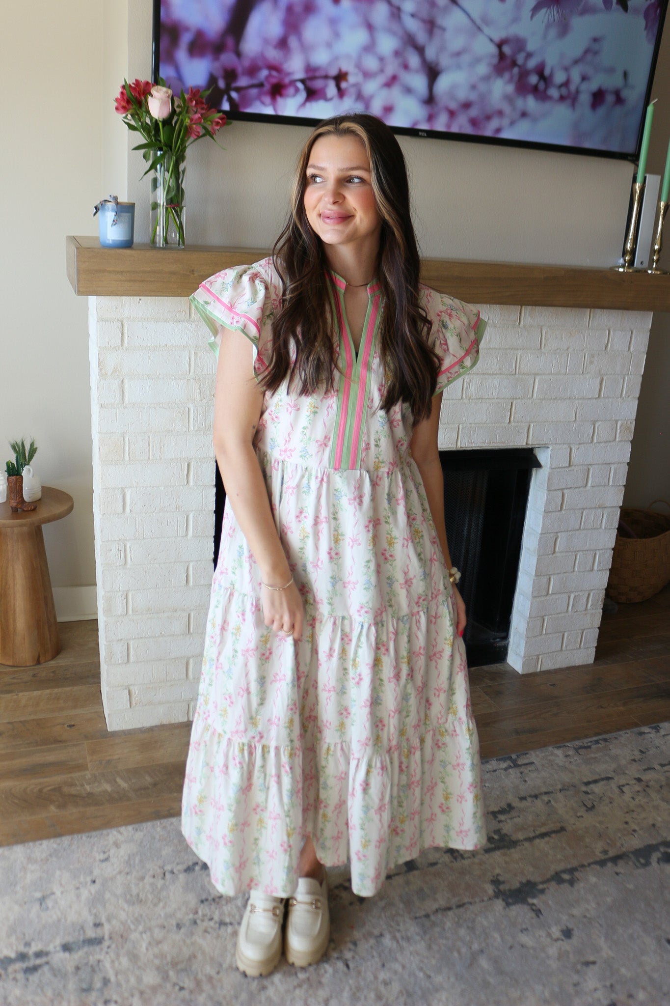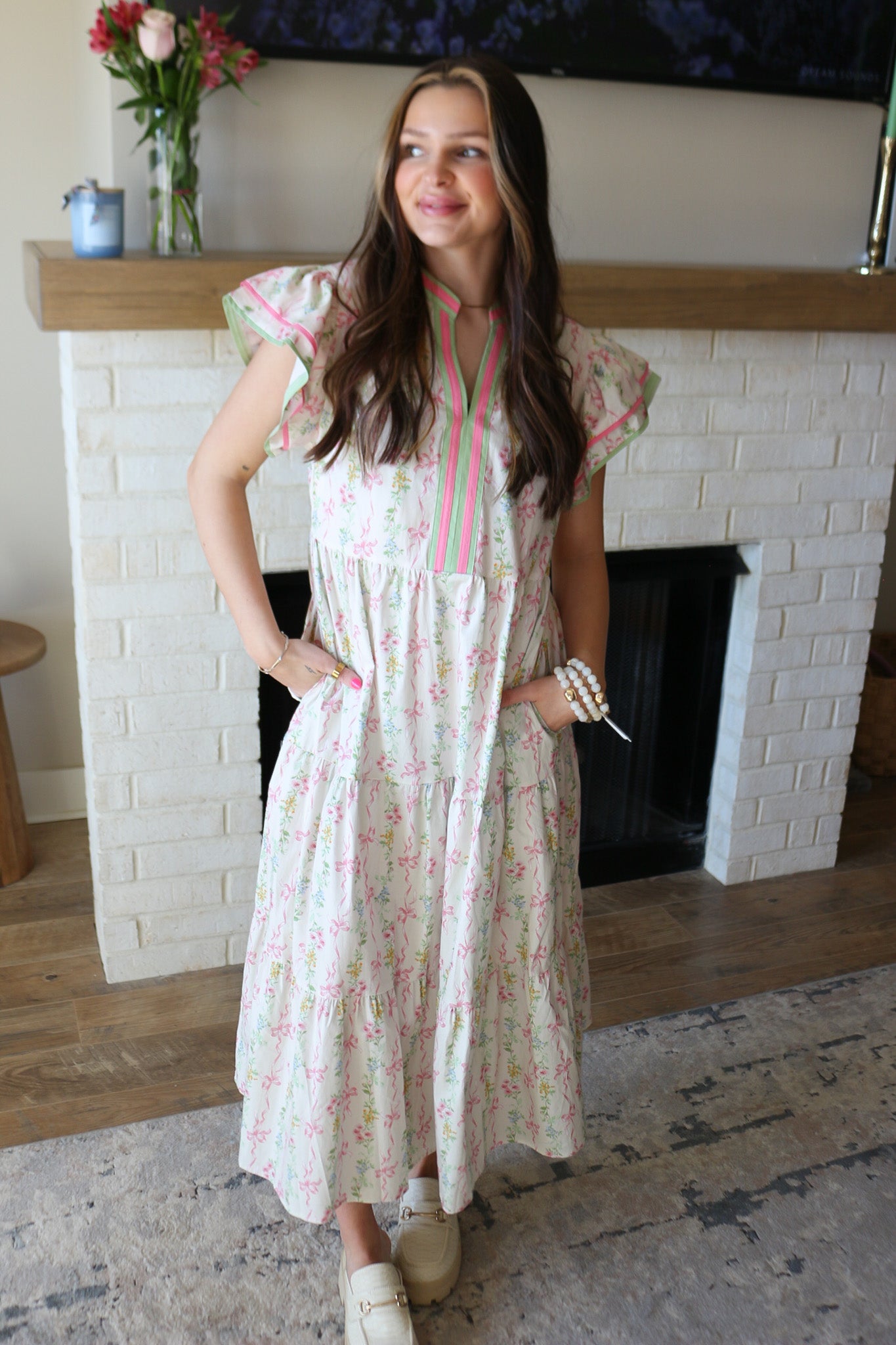 Twirl into spring in this enchanting pink floral maxi dress, where delicate blooms dance across luxurious fabric. The signature bow detail adds a touch of romantic whimsy, perfect for garden parties, weddings, or any occasion calling for effortless elegance. Flowing silhouette flatters every figure while the vibrant floral print makes a bold statement. Slip it on and let your inner babe blossom.
