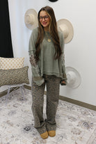 Throw on this laid-back faded olive top and embrace effortless style. Delicate lace detailing and patchwork accents on the sleeves add a touch of personality to your everyday rotation. Perfect for cozy days when you want comfort without sacrificing that extra flair. Whether you're running errands or settling in for the weekend, this versatile piece keeps you looking put-together and feeling great.