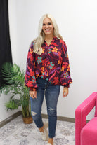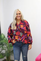 Harvest Bloom Eggplant Purple Floral Blouse