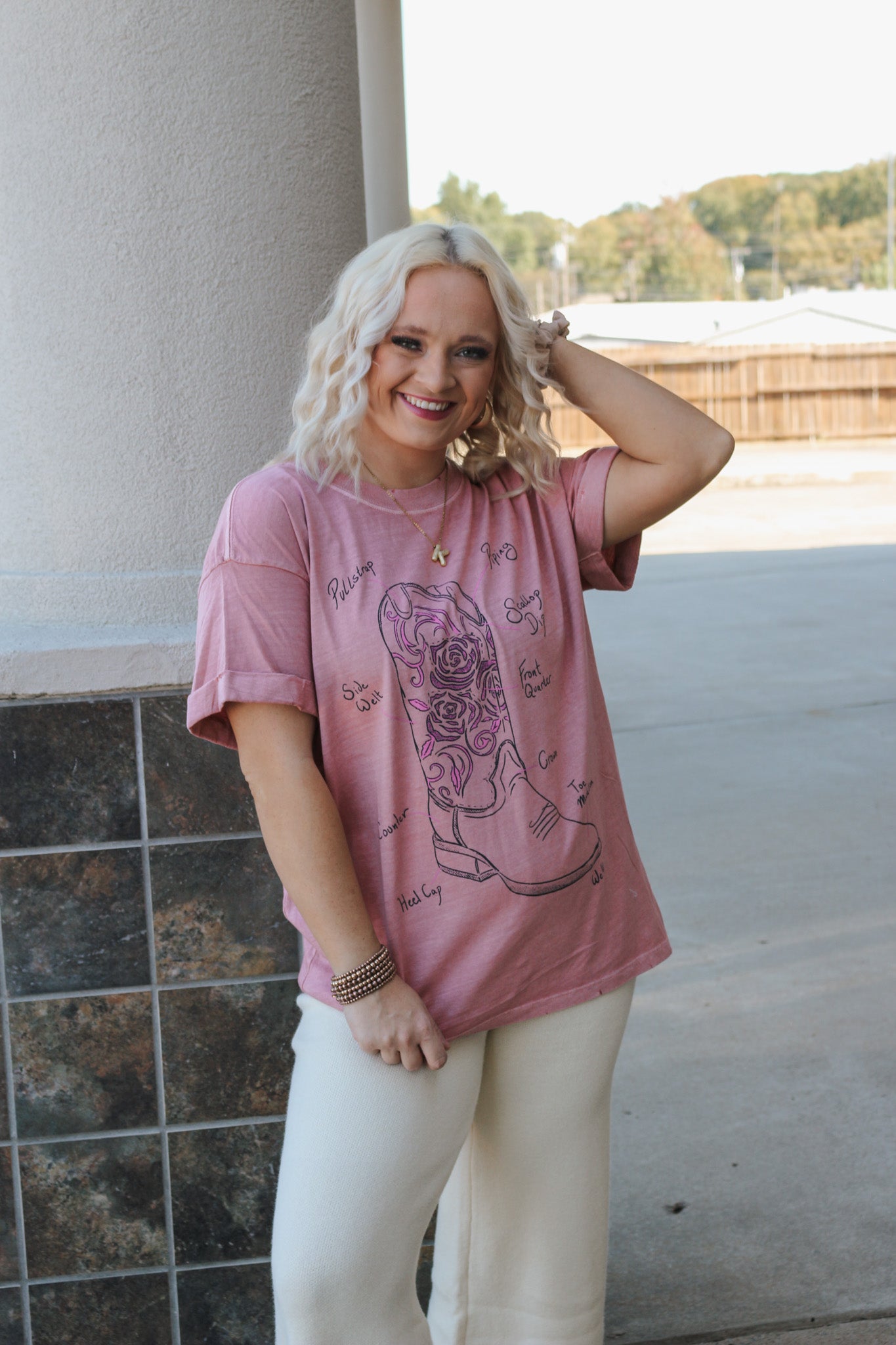 Unleash your inner cowgirl with our Dusty Pink Western Boot Graphic Tee! Featuring a striking dusty pink color and a bold western boot graphic, this tee is perfect for adding a touch of cowgirl charm to any outfit. Made with soft and comfortable material, it's the perfect addition to your wardrobe.