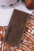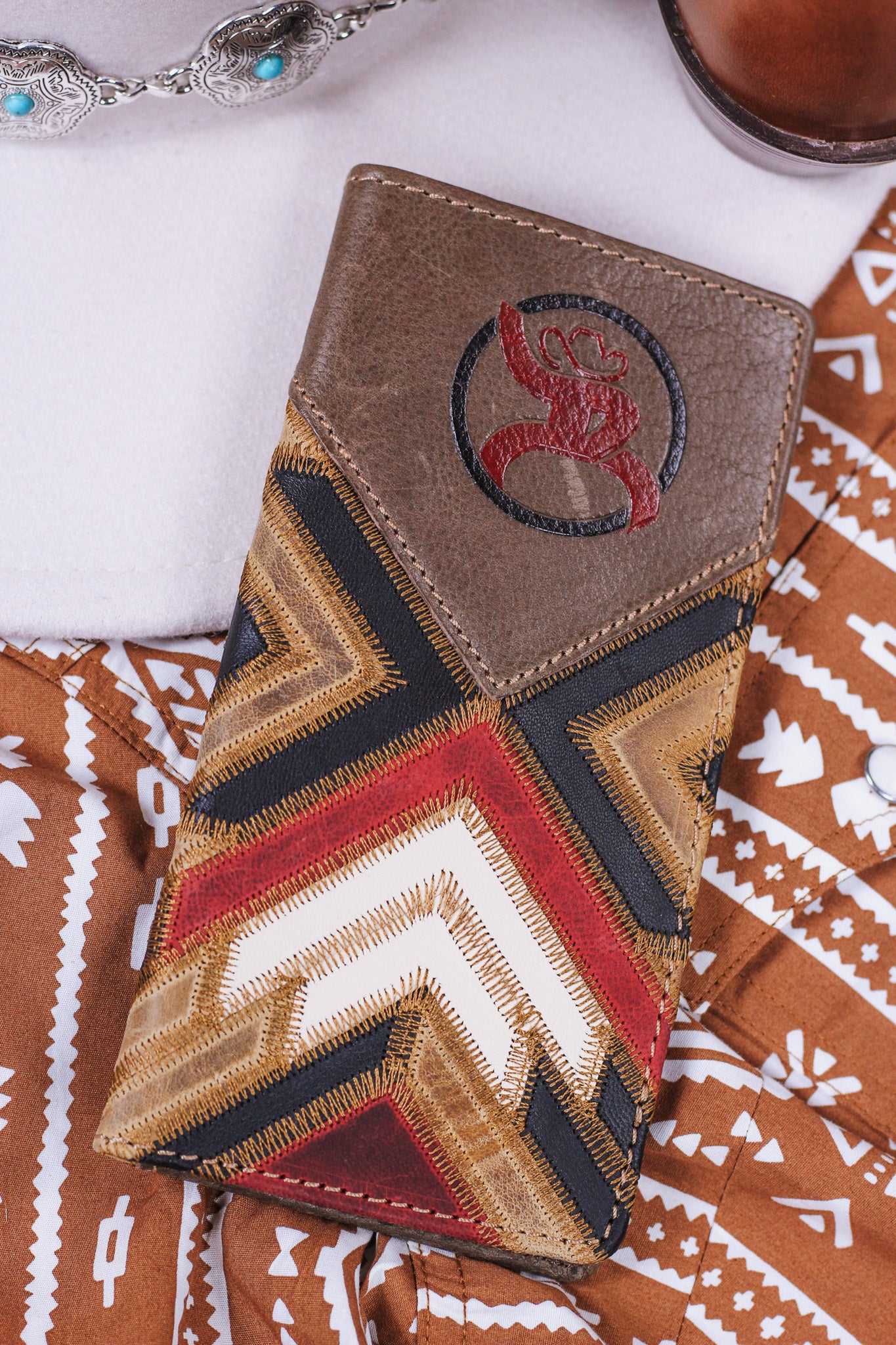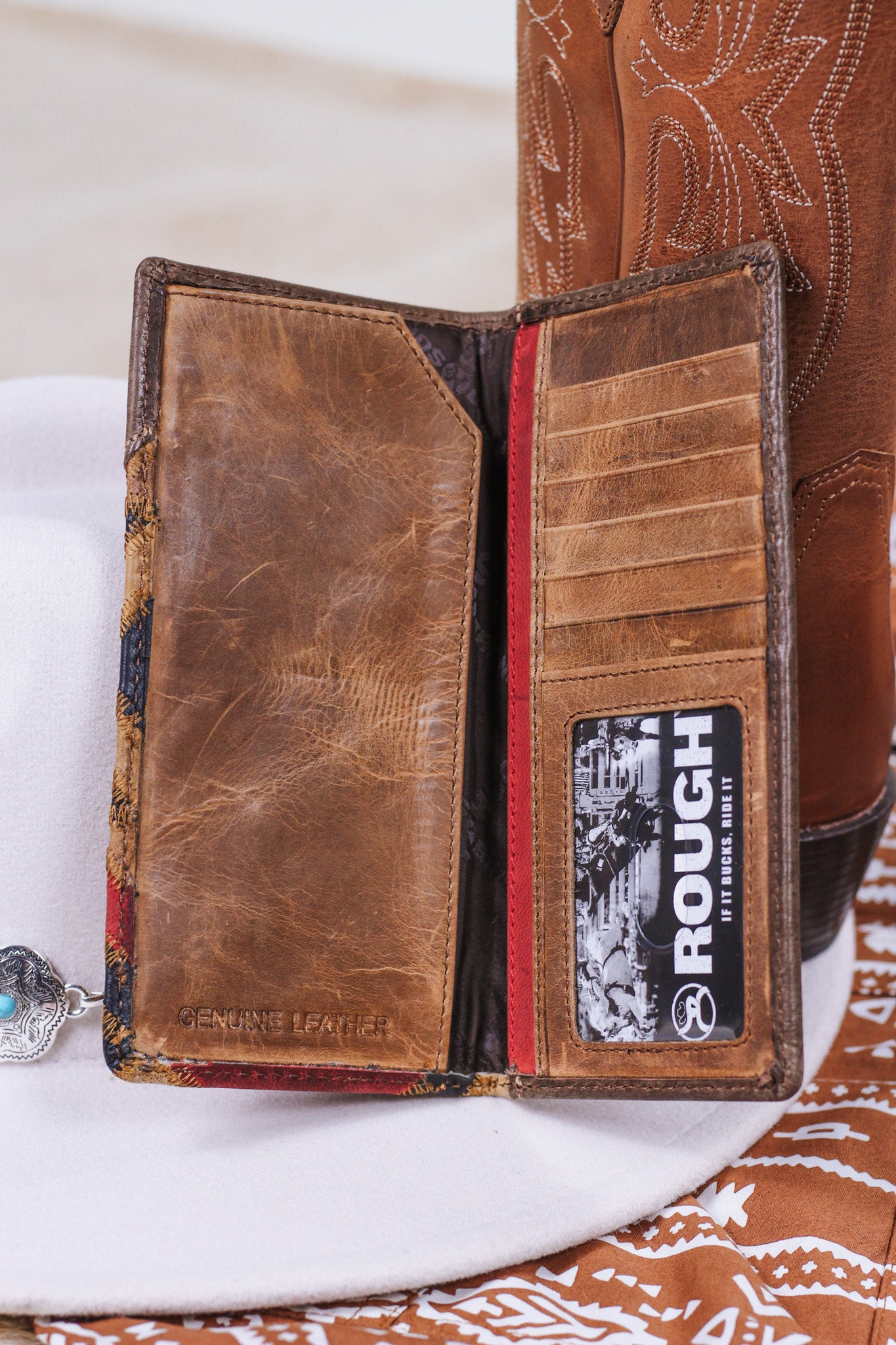 This Roughy rodeo wallet features patchwork with brown leather overlay, detailed with red & black logo and includes our custom hooey brands woven logo liner.