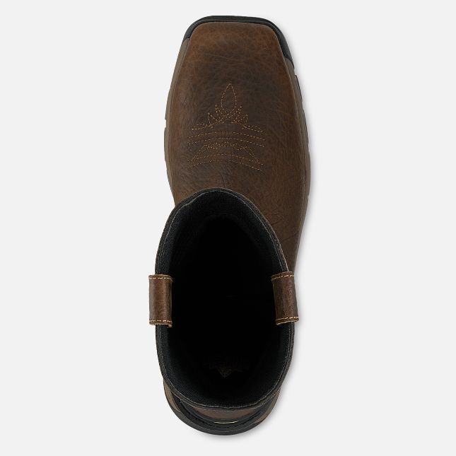 The 11-inch Two Harbors waterproof leather safety toe pull-on boot is fully equipped to handle heavy duty outdoor work. The non-metallic nano toe provides ample protection with a lightweight design shaped for more toe room. Full-grain leather ensures high durability. The TPU heel cup makes the boot easier to pull on and off. Together, the stable heel and flexible forefoot keep you steady and ready for action. Inside, military-grade lining wicks away moisture. UltraDry™ waterproofing keeps your feet dry in wet conditions. The tread pattern delivers ideal traction, and the boot's slip resistance meets the new ASTM standard. Square toe Western styling offers a comfortable fit.