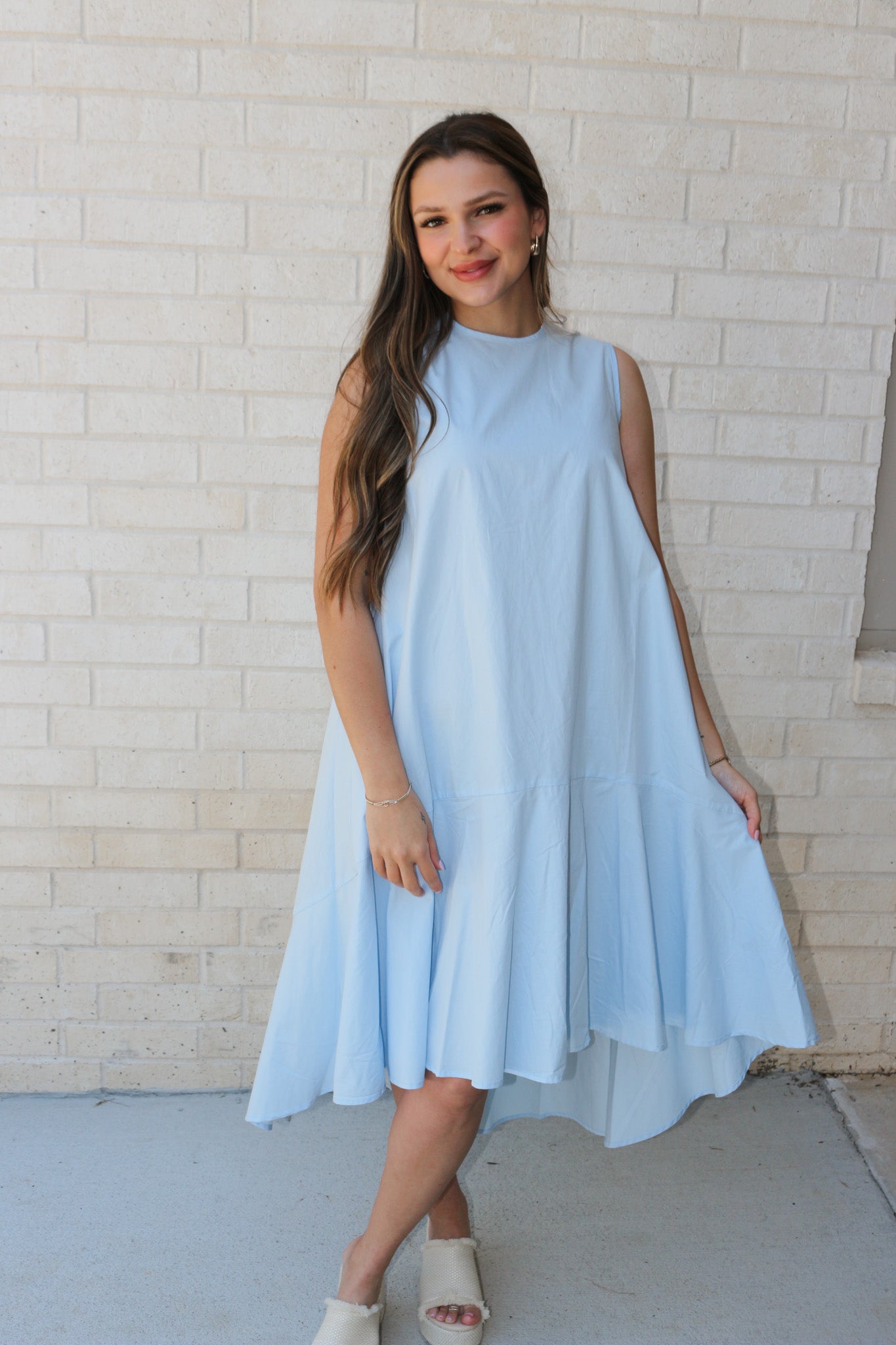 This Poplin Sleeveless Hi Low Dress is designed with a breathable, lightweight fabric for comfortable, all-day wear. The hi-low hem allows for versatile styling options, while the sleeveless design keeps you cool. Perfect for a day out or a casual night in.