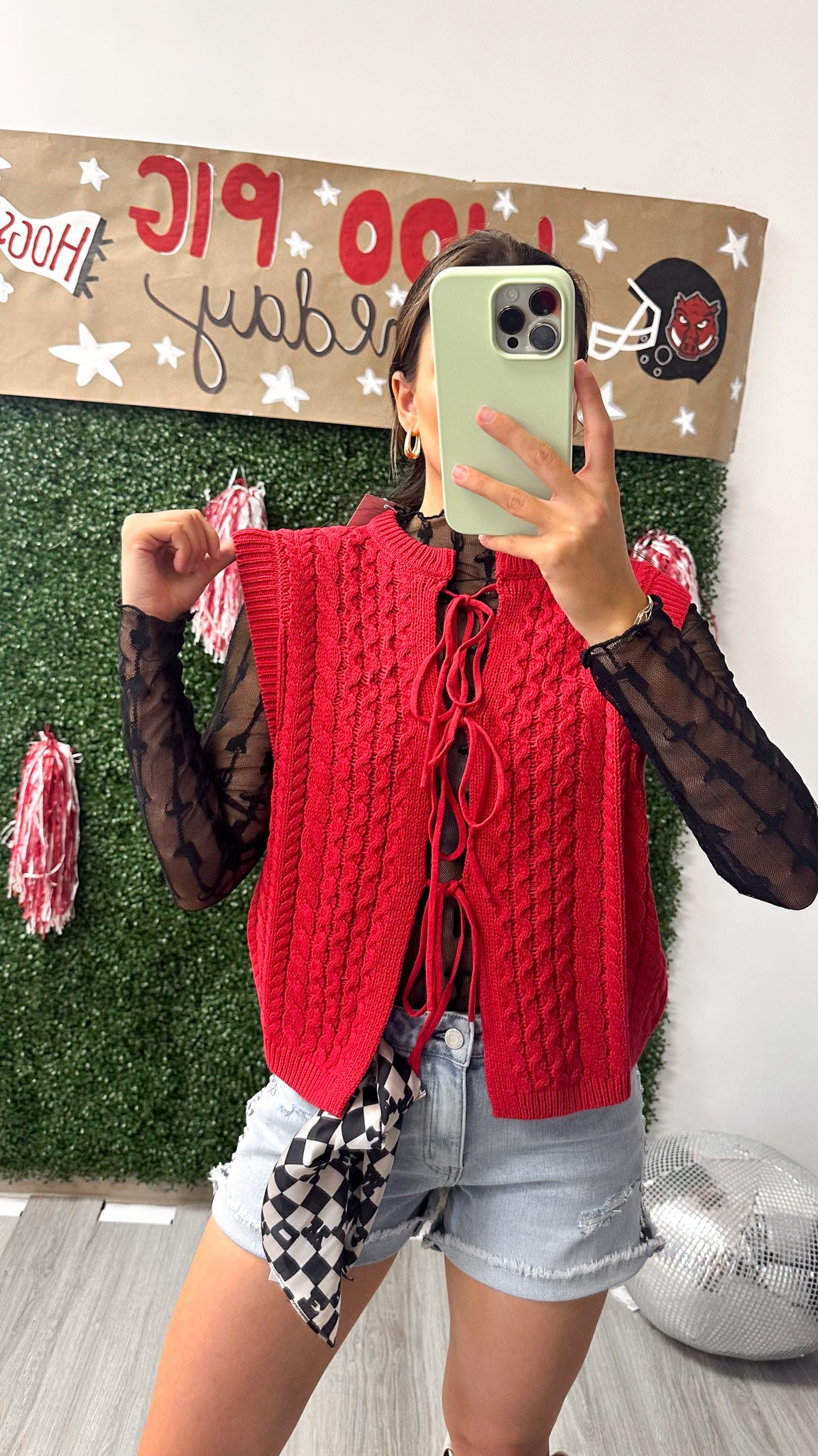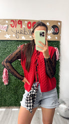 Add a splash of fun to your outfit with the Playbook Picks Red Sweater Vest! Featuring an open front tie, this playful piece lets you customize your look with an easy, stylish knot. Perfect for layering or wearing solo, it brings cozy warmth and a pop of color wherever you go.
