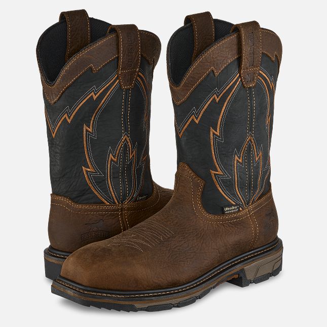 The 11-inch Marshall waterproof leather safety toe pull-on boot holds up in demanding jobs, including farming and ranching, warehousing, transportation and construction. UltraDry™ waterproofing with an exclusive Irish Setter lining delivers dry, long-lasting comfort. The removable polyurethane footbed provides instant underfoot support. The RPM™ midsole offers extra cushioning while reducing the weight of the boot. The non-metallic safety toe meets ASTM standards for protection. The outsole maximizes slip, oil/gas and heat resistance with a durable rubber skin. Pull-on straps make getting in and out of the boots that much easier. Full grain leather with detail stitching completes the uniquely stylish look.