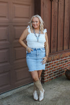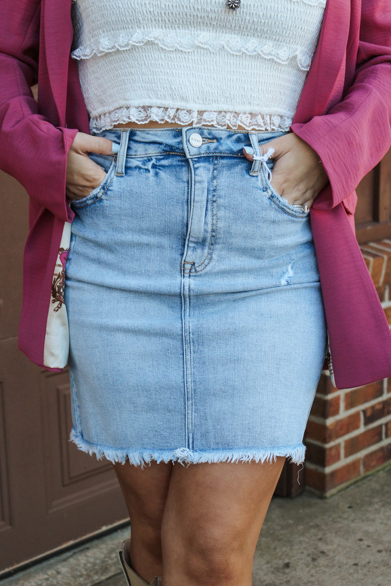 Rise to new fashion heights with the Risen High Rise Denim Skirt. This versatile skirt features a flattering high waist and stylish denim fabric, perfect for any occasion. Dress it up or down for a look that is sure to turn heads. Because sometimes, a little rise is all you need.