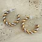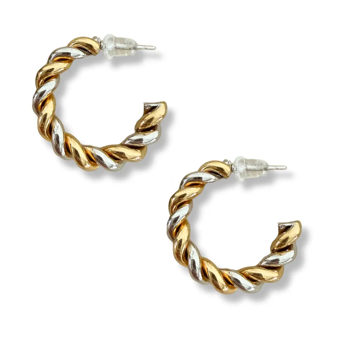 A modern twist on your everyday hoop. These mixed-metal earrings blend gold and silver tones with a smooth, braided design that instantly elevates any look. Lightweight, water-resistant stainless steel makes them perfect for all-day wear — no tarnishing, no hassle.