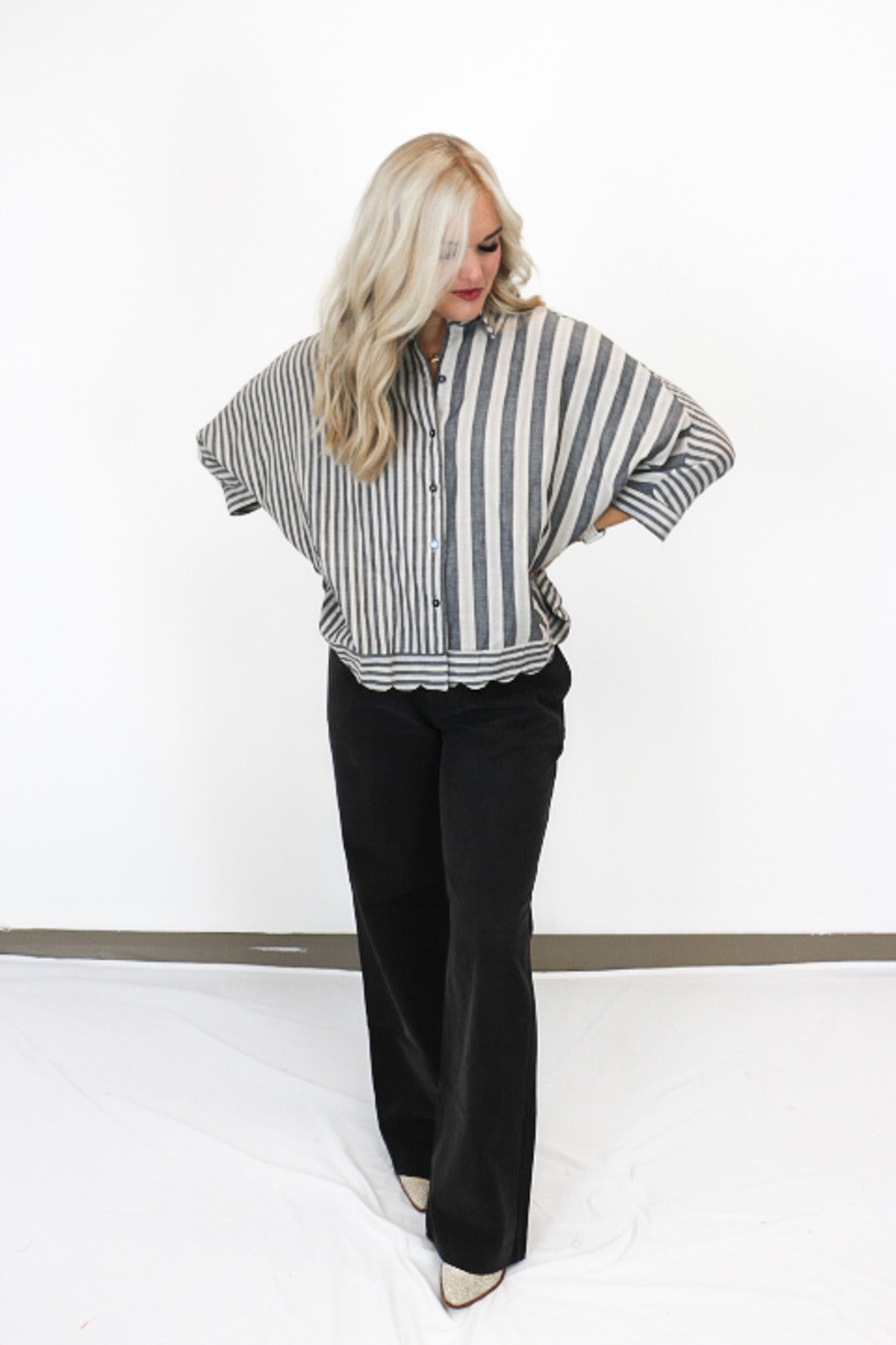 Step into bold comfort with the Old Time Sake Black Stripe Blouse. This oversized, button-up blouse combines relaxed fit with classic stripes for an effortlessly cool look. Perfect for layering or wearing on its own, it brings fun and flair to your everyday style while keeping you cozy and chic.
