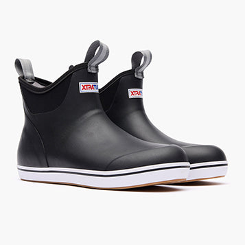 Due to popular demand, this black ankle deck boot has been crafted specifically for a female fit. Anglers are athletes, and like any athlete they need the best footwear to help them perform at a high level. We've created a lightweight design with the same slip-resistant Chevron outsole found in our Legacy boots. The performance ankle deck boot is the perfect boot for any on the water athlete looking for protection with slip-on-and-go styling. This boot is constructed with hand-layed rubber, therefore it's not a commercial grade boot.