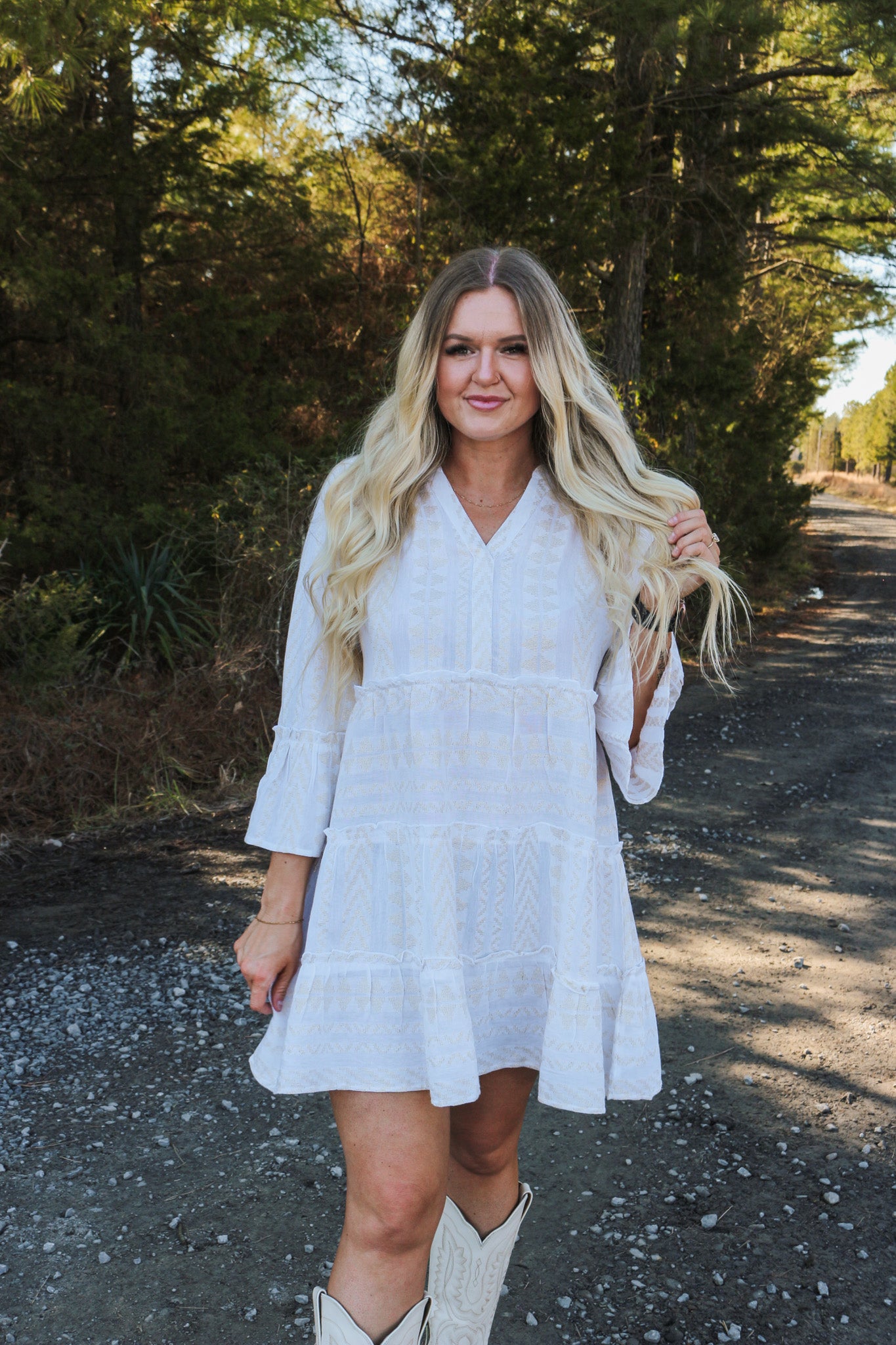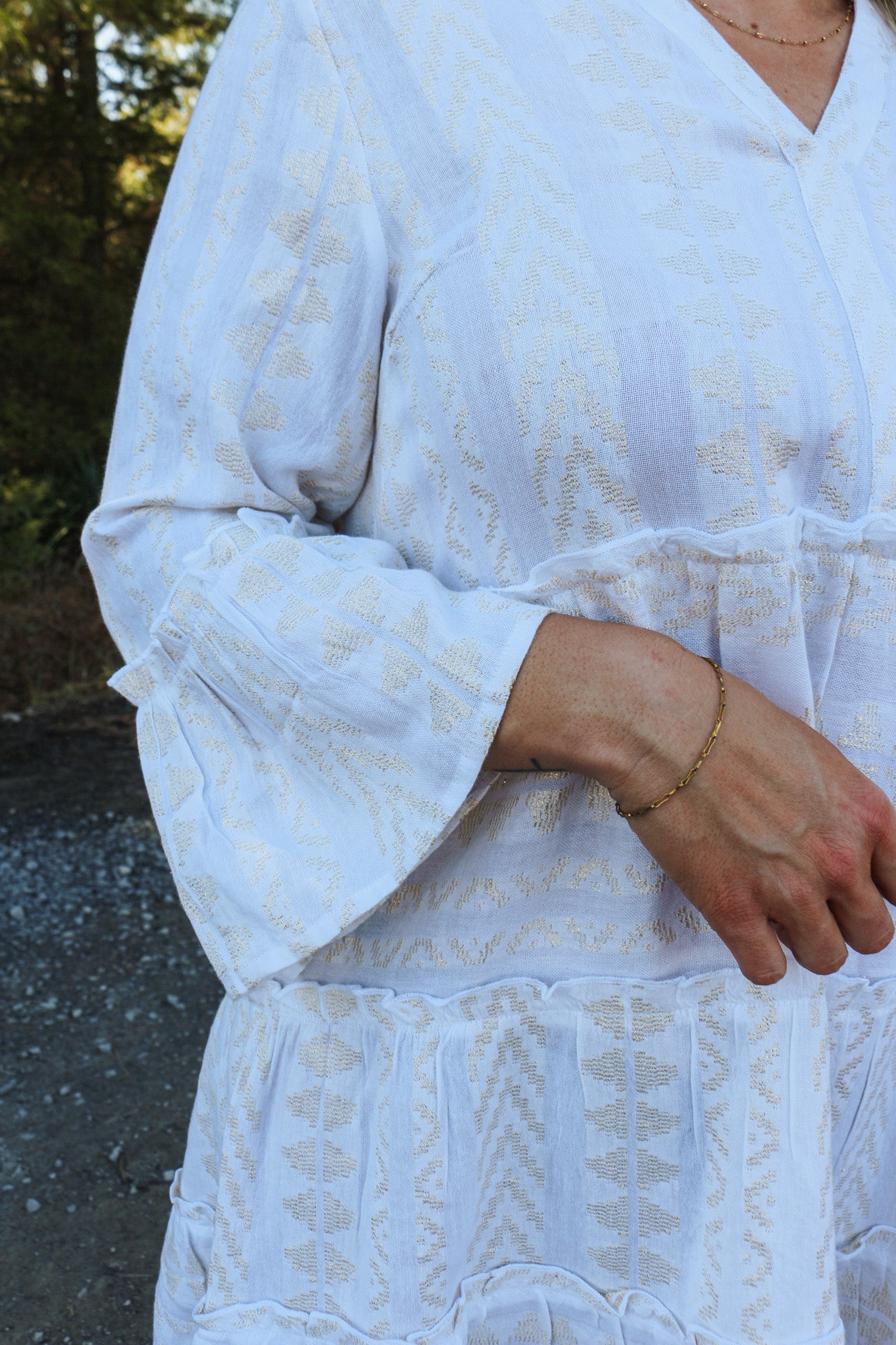 Elevate your style with the Found A Keeper White Gold Jacquard Dress. Its luxurious quarter sleeves add a touch of elegance to any event, making you stand out and feel confident. Embrace sophistication and comfort with this stunning dress - a must-have for any fashion-forward wardrobe.