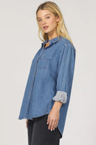Galina long sleeve button-up shirt in medium wash for ultimate elegance and comfort.
