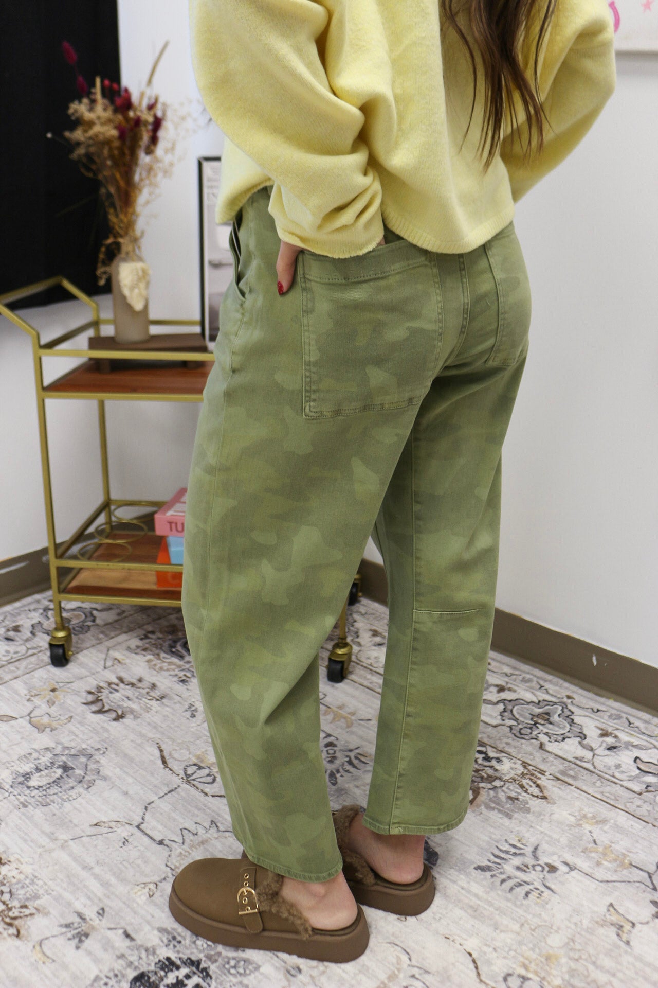 These high-rise barrel jeans deliver that perfect vintage-inspired silhouette with a modern twist. Crafted from a breathable cotton-blend fabric with just enough stretch, they hug your curves in all the right places while keeping you comfortable all day long. The clean hem hits right at the ankle for an effortlessly chic look that pairs with everything from sneakers to boots. A playful camo print adds personality to your everyday rotation—because why blend in when you can stand out?