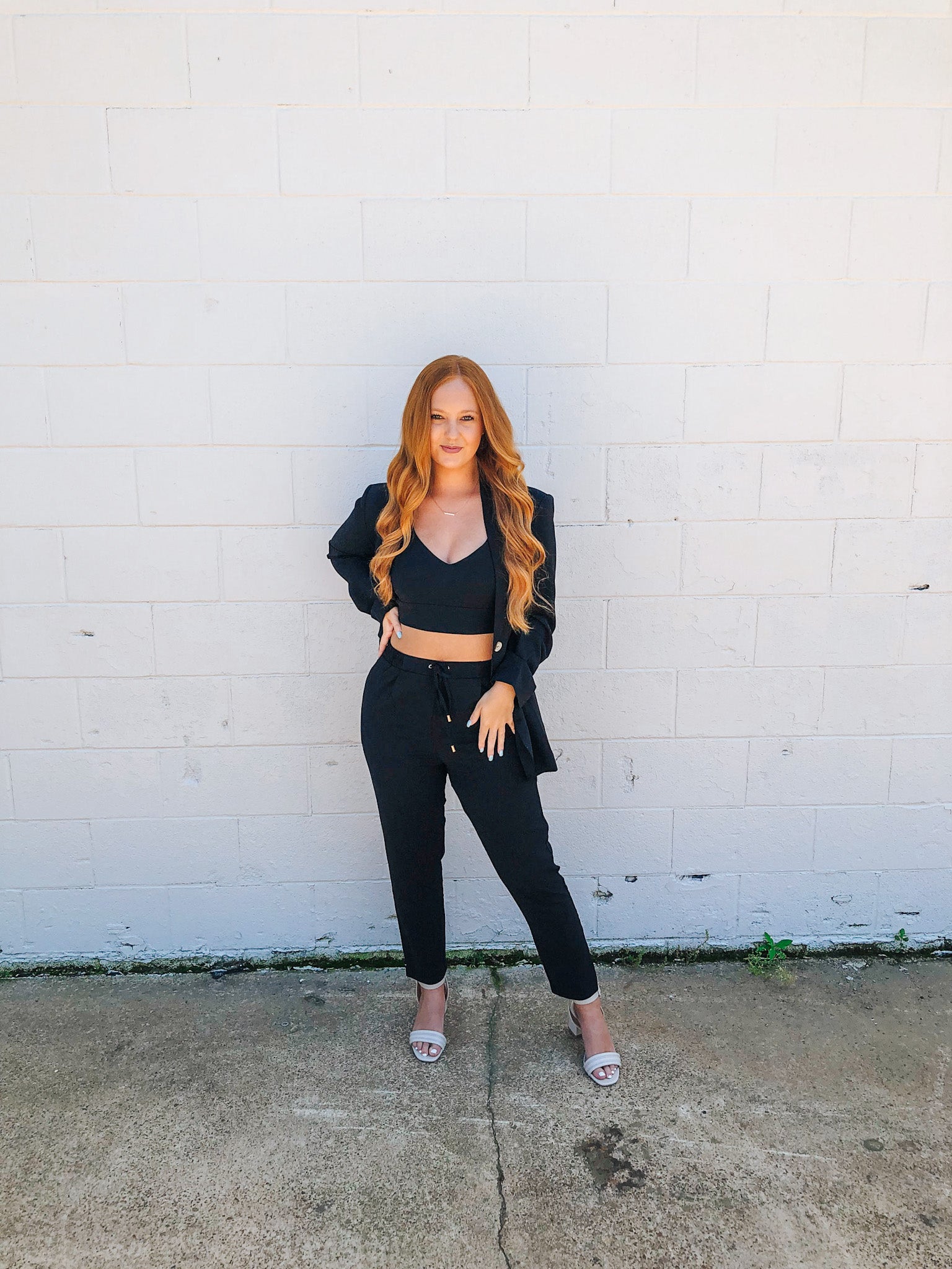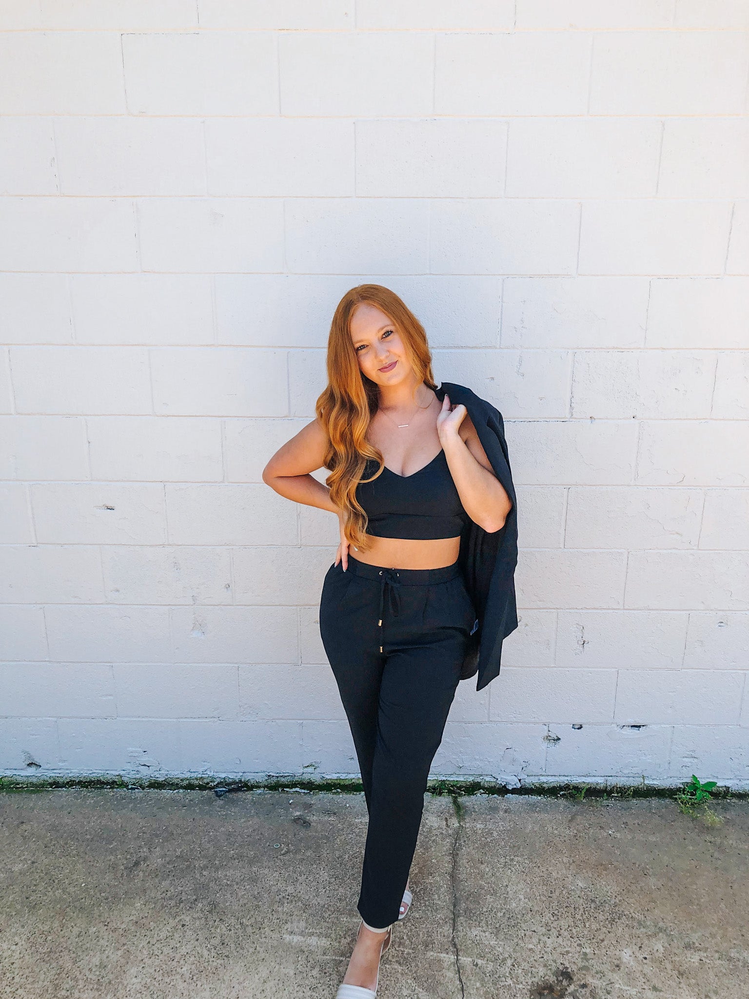 This tank top has a cropped fit and pairs well with literally any bottoms! Has a matching blazer and dress pant.
