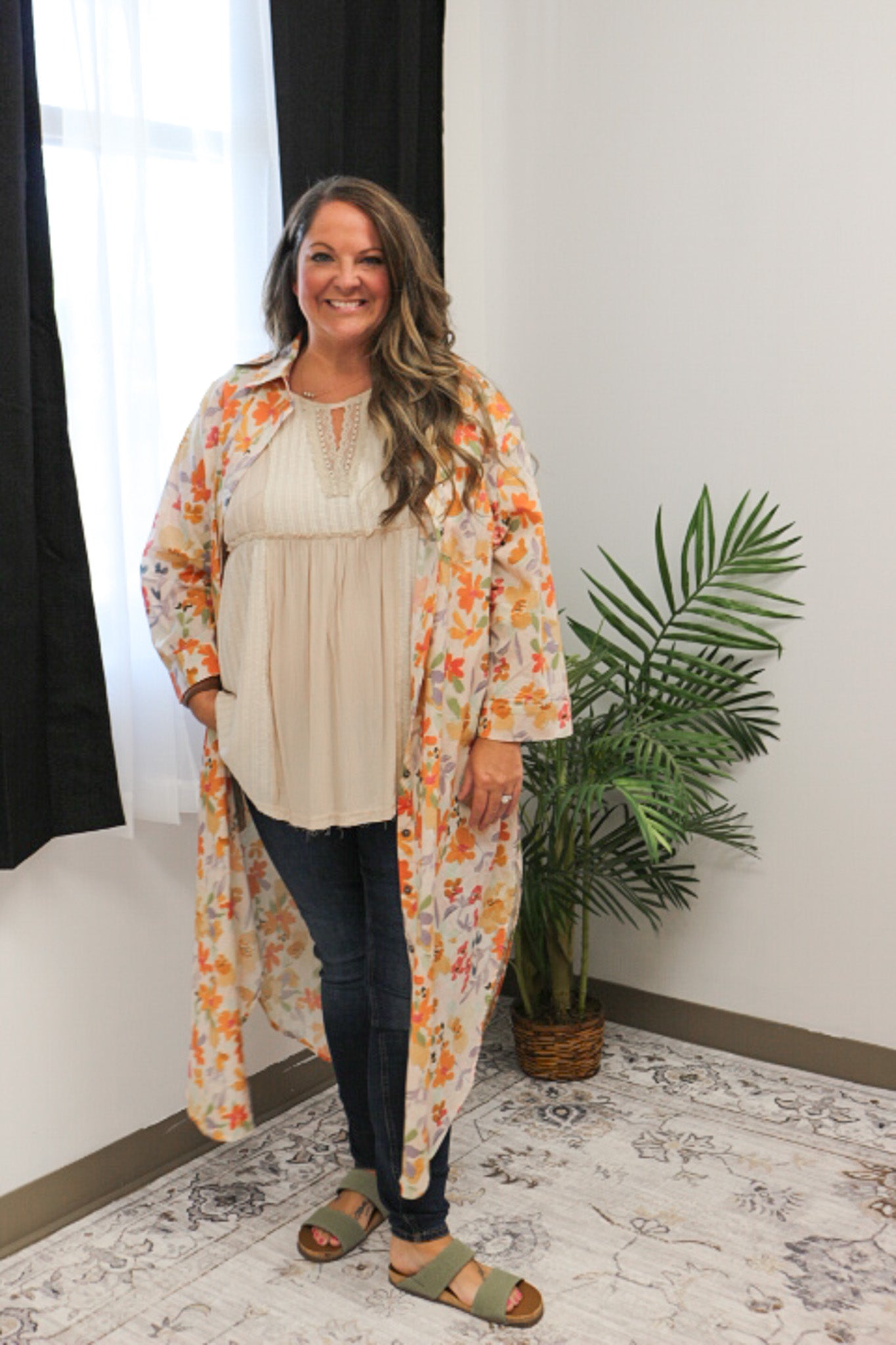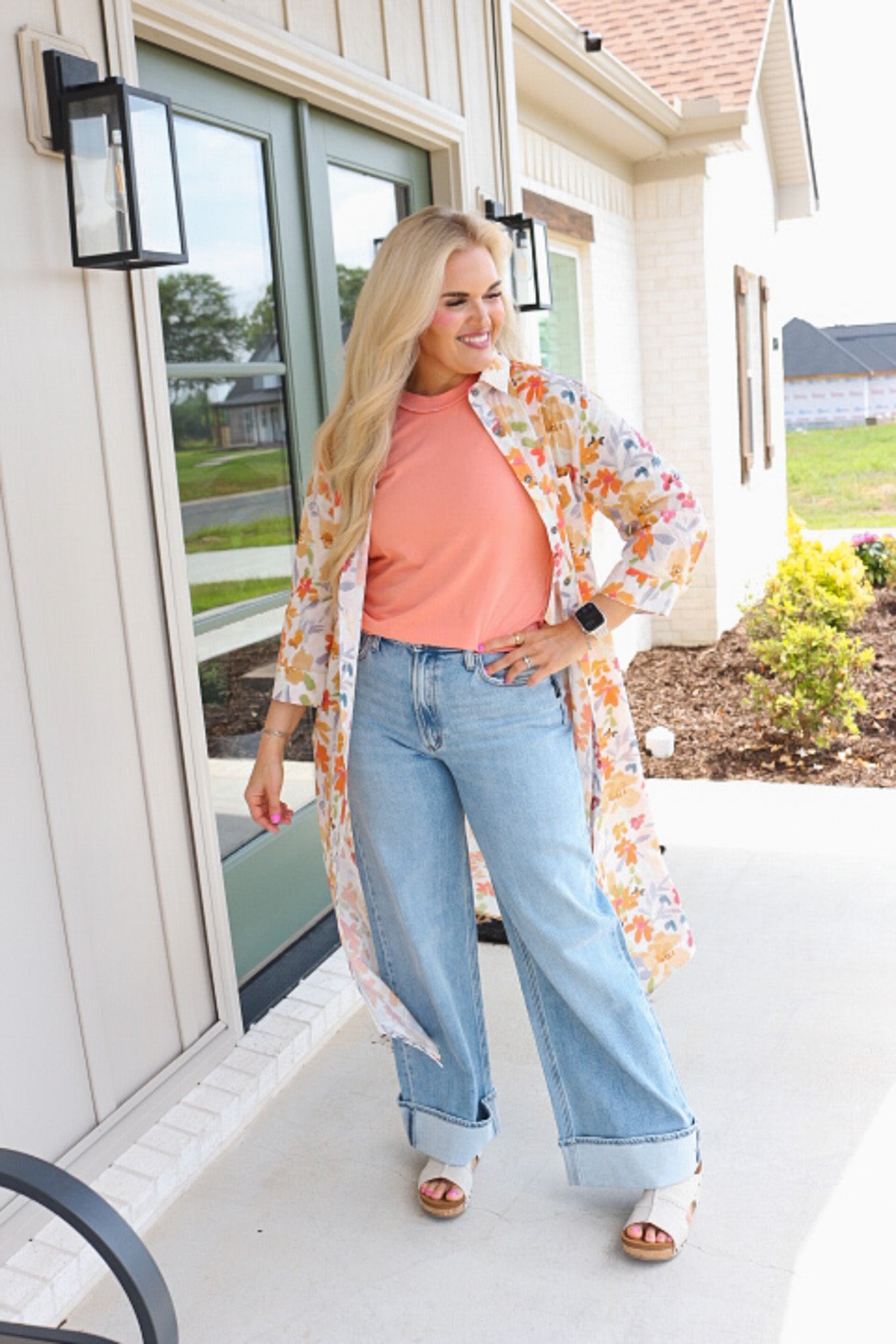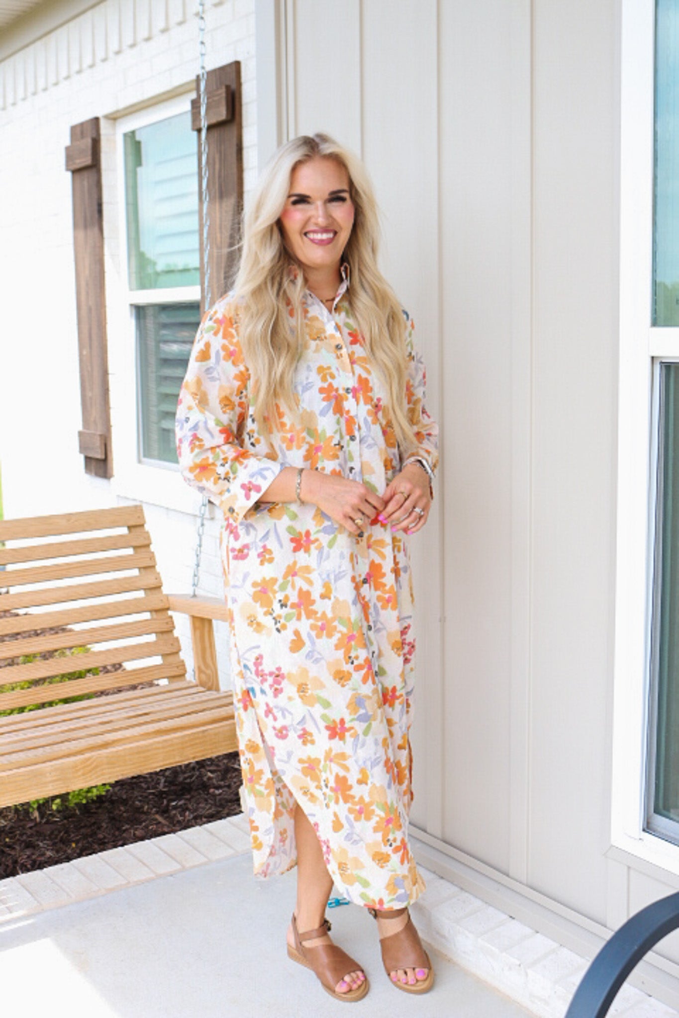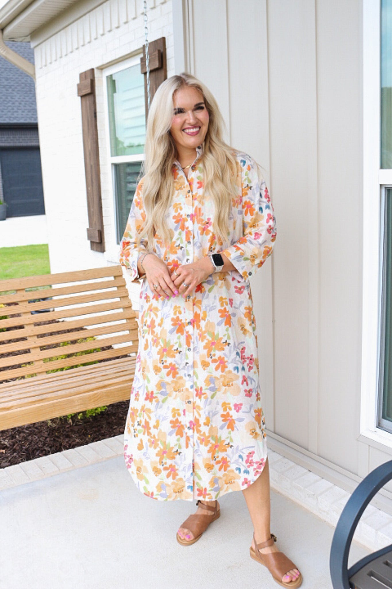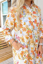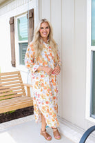 - The Harmony Blooms Orange Floral Dress is a stunning midi button-up dress.