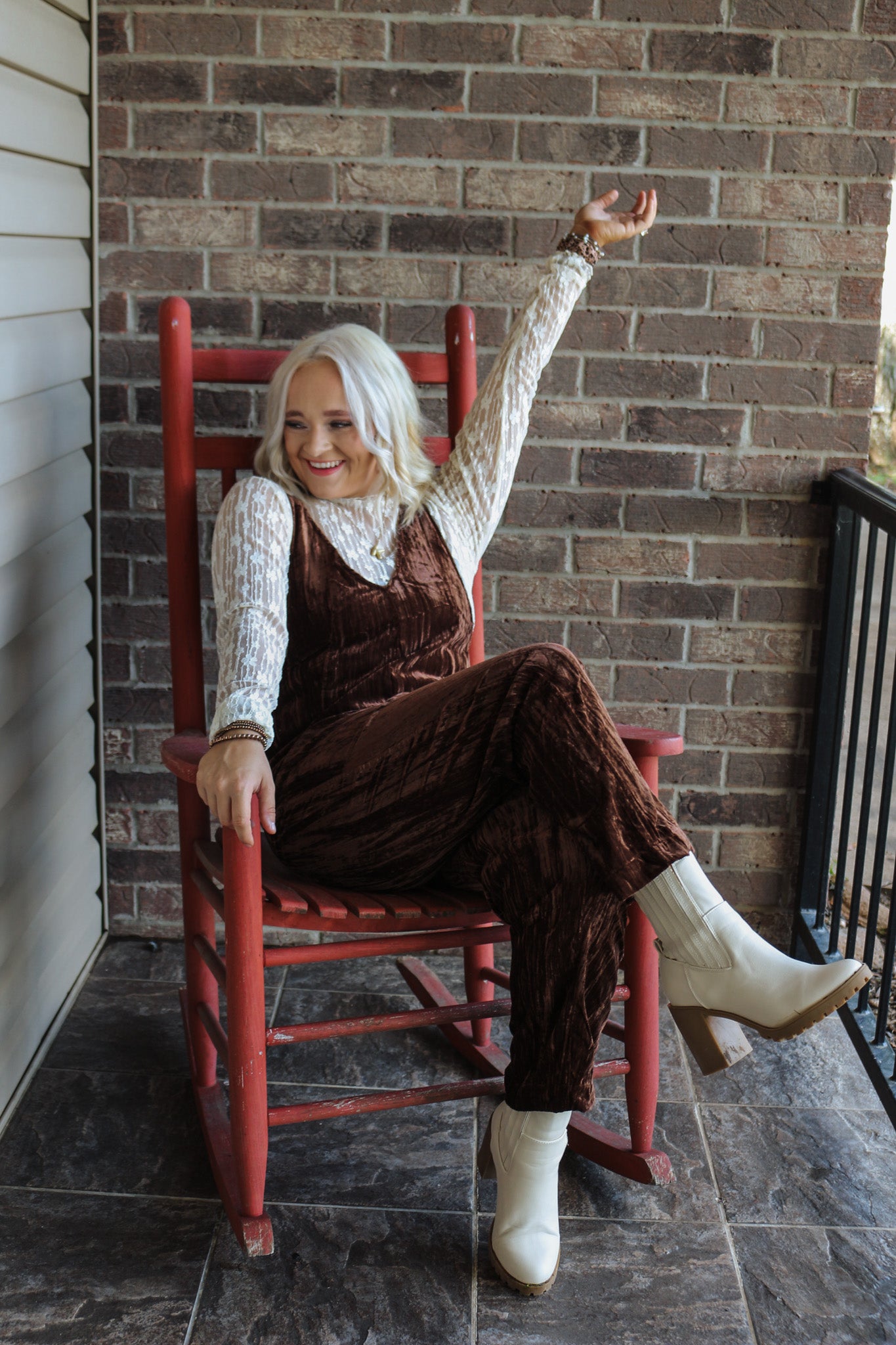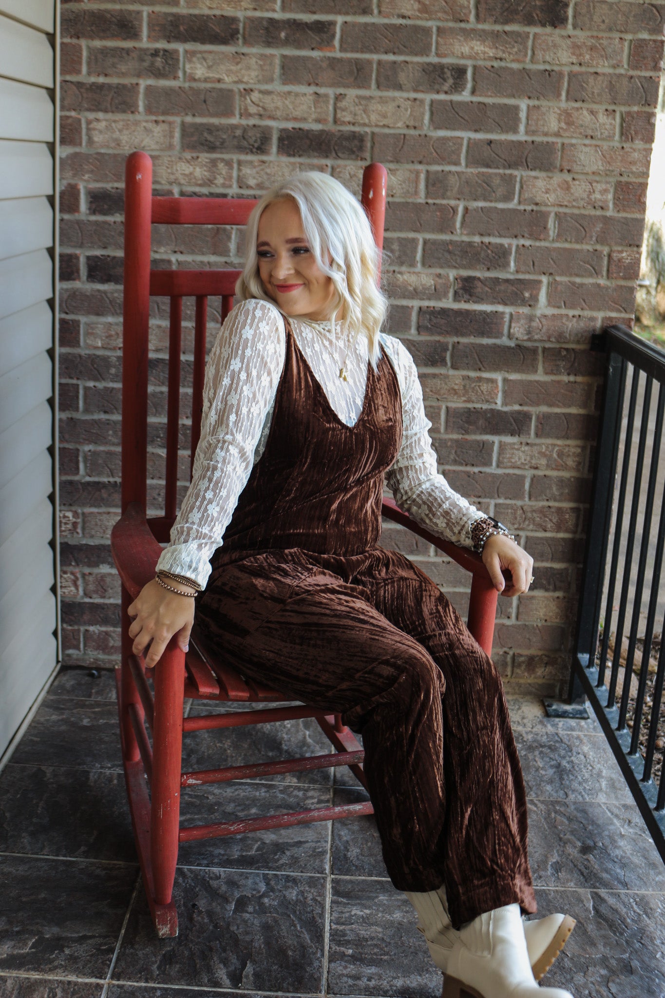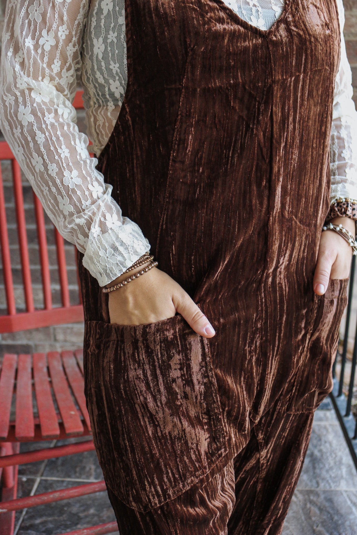 Indulge in luxurious comfort with our Remind Me Again Brown Velvet Jumpsuit. The rich brown velvet fabric adds a touch of elegance, while the jumpsuit design offers a stylish and effortless look. Perfect for all-day wear, this jumpsuit is a must-have addition to your wardrobe.