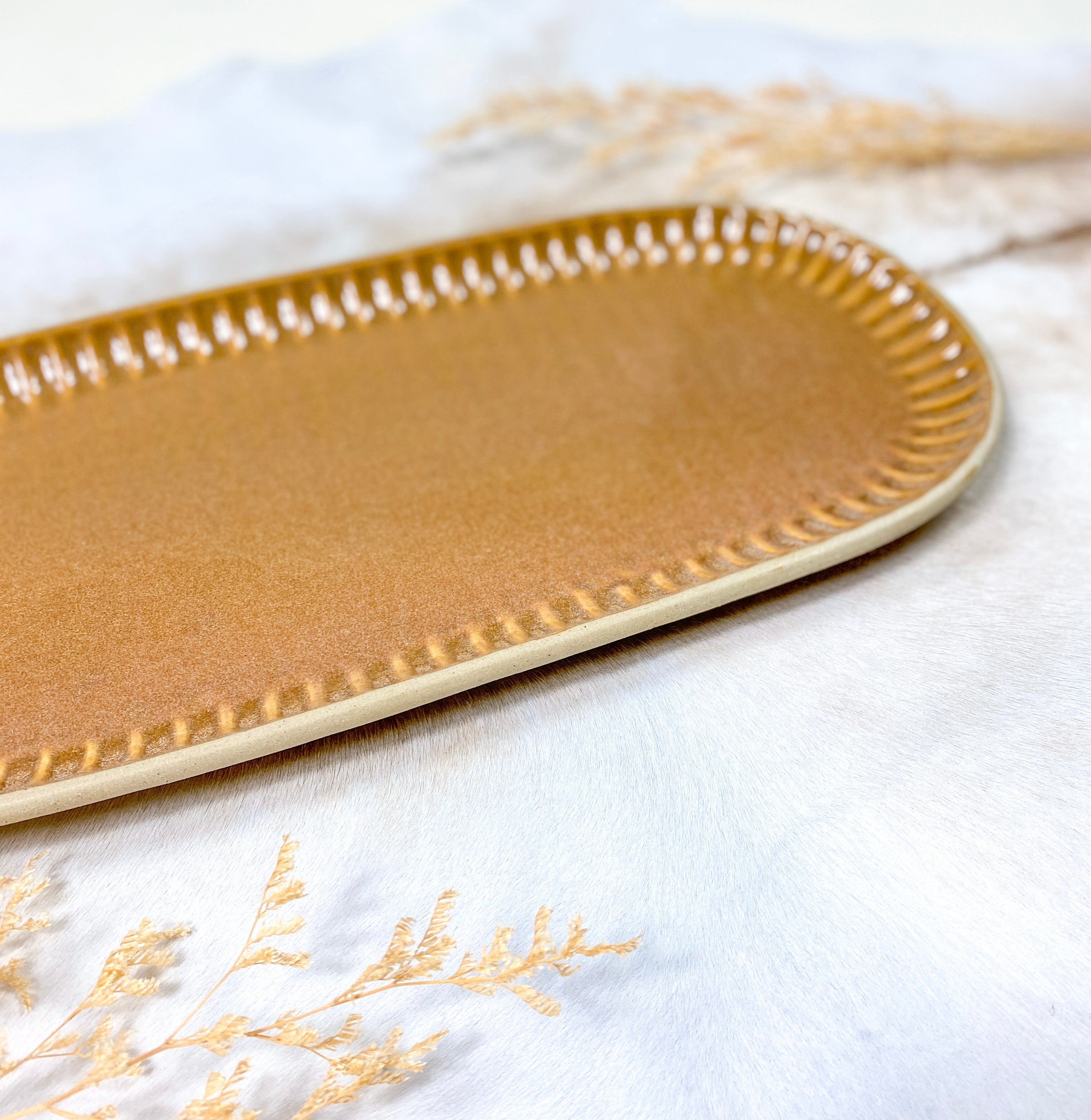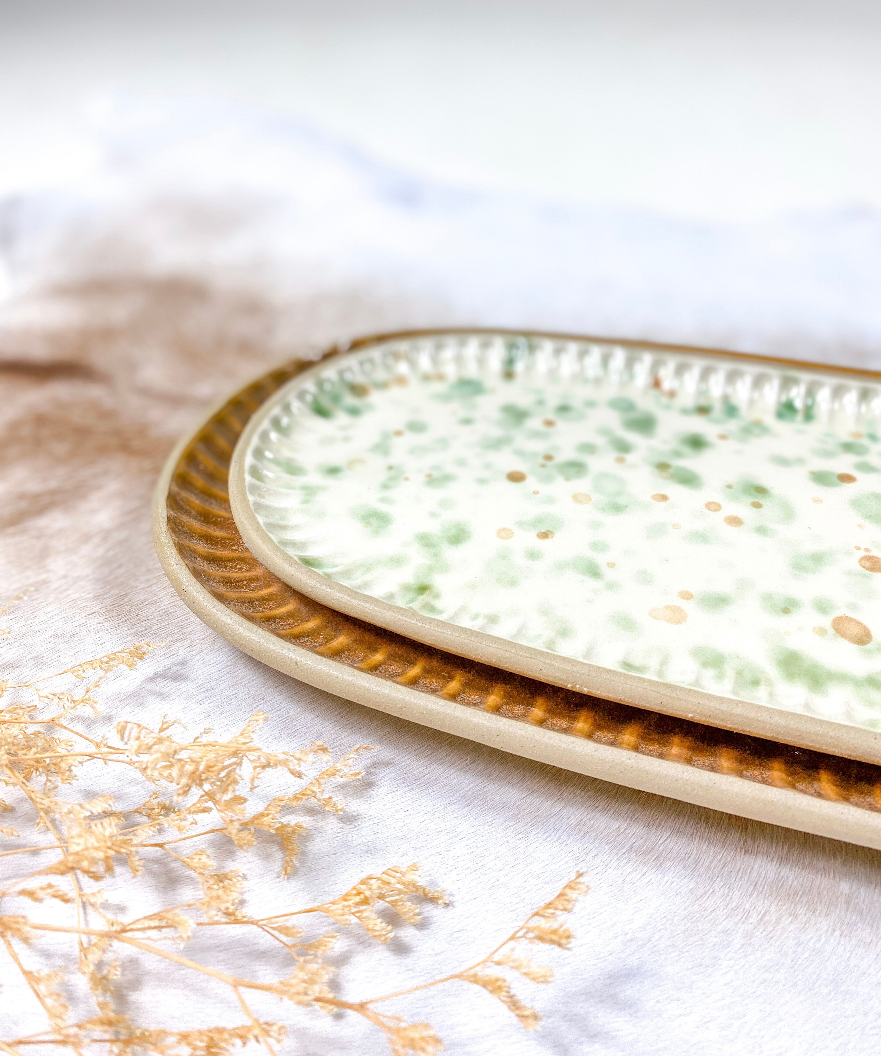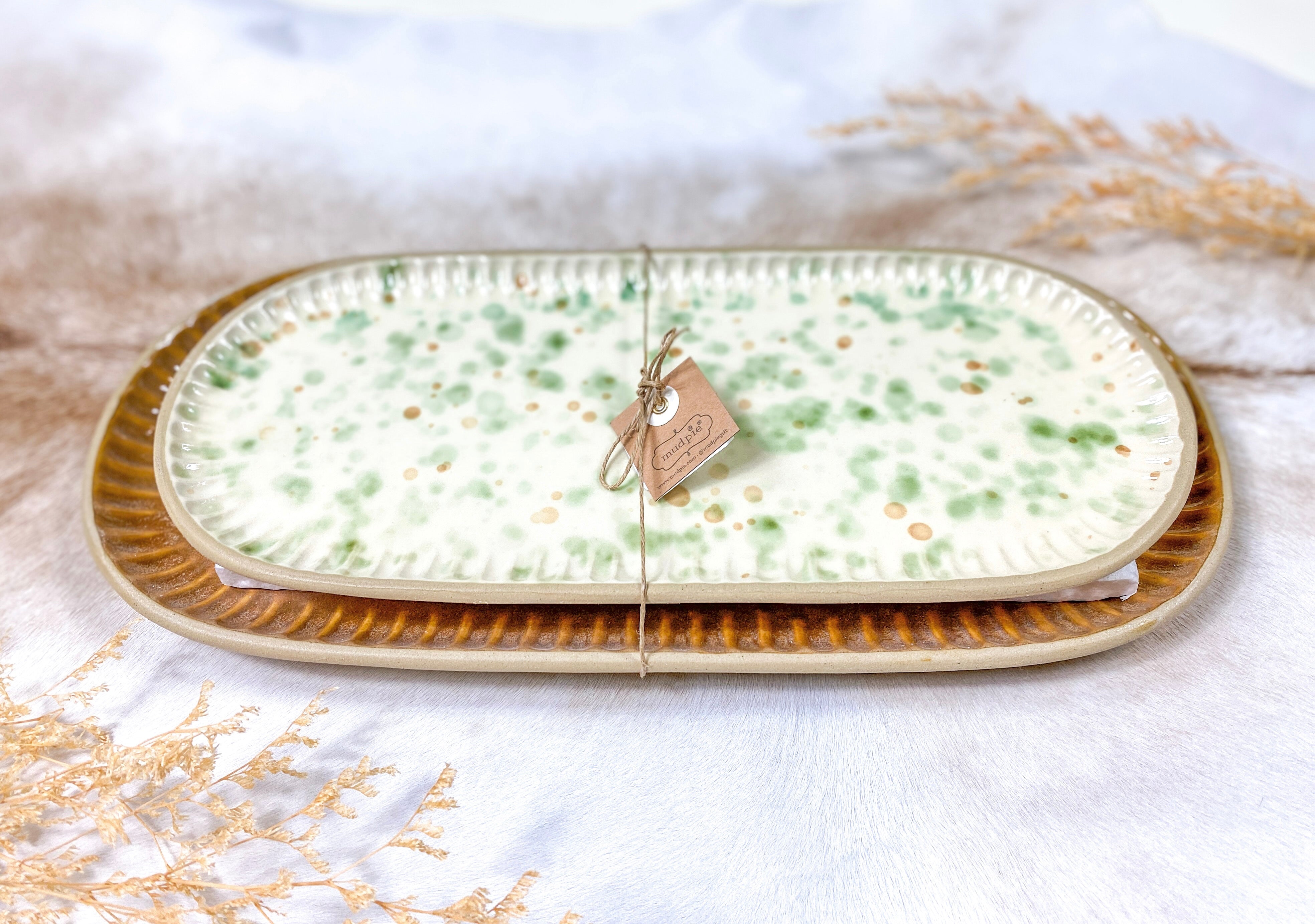 Upgrade your next event with our eye-catching Splatter Nested Platters. This set includes two meticulously crafted platters designed to steal the show. Made of durable stoneware, these nested platters offer a unique combination of hand-painted artistry and exquisite reactive glazed details. The larger platter, measuring 16" x 7 1/2", boasts a mesmerizing hand-painted design that adds a touch of sophistication to your table setting. Meanwhile, the smaller platter, measuring 14" x 6", features captivating reactive glazed details that create an alluring visual effect. Designed for convenience, these nested platters are ideal for serving a variety of dishes, from appetizers to desserts. While they are dishwasher safe, we recommend hand washing for maintaining their original splendor. Make a statement at your next event with our Splatter Nested Platters. Order now and elevate your dining experience with these exquisite and versatile pieces.