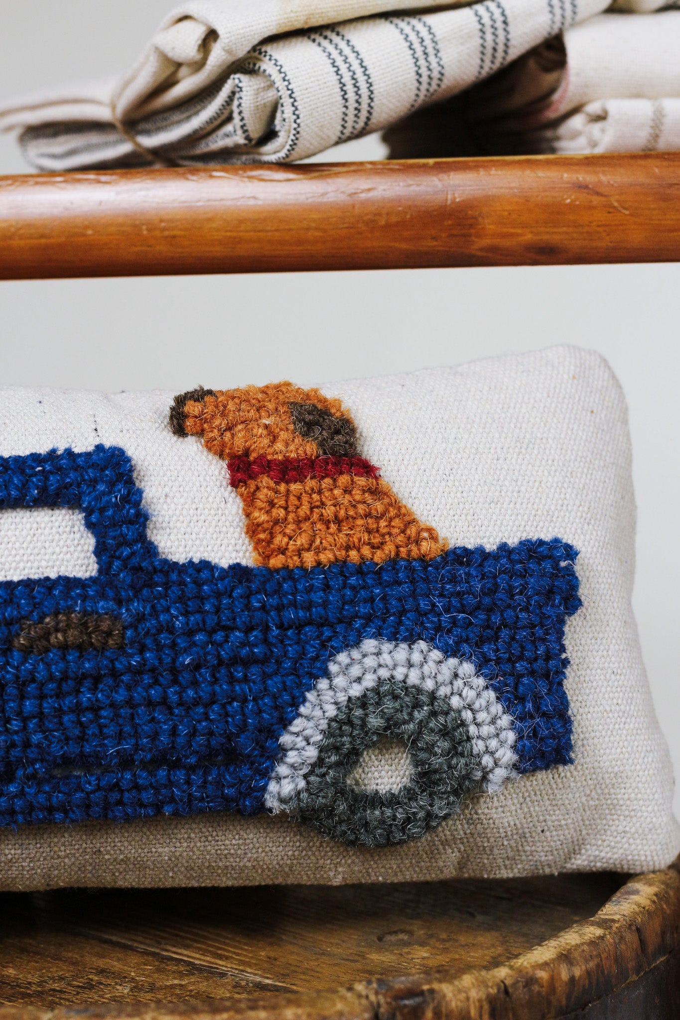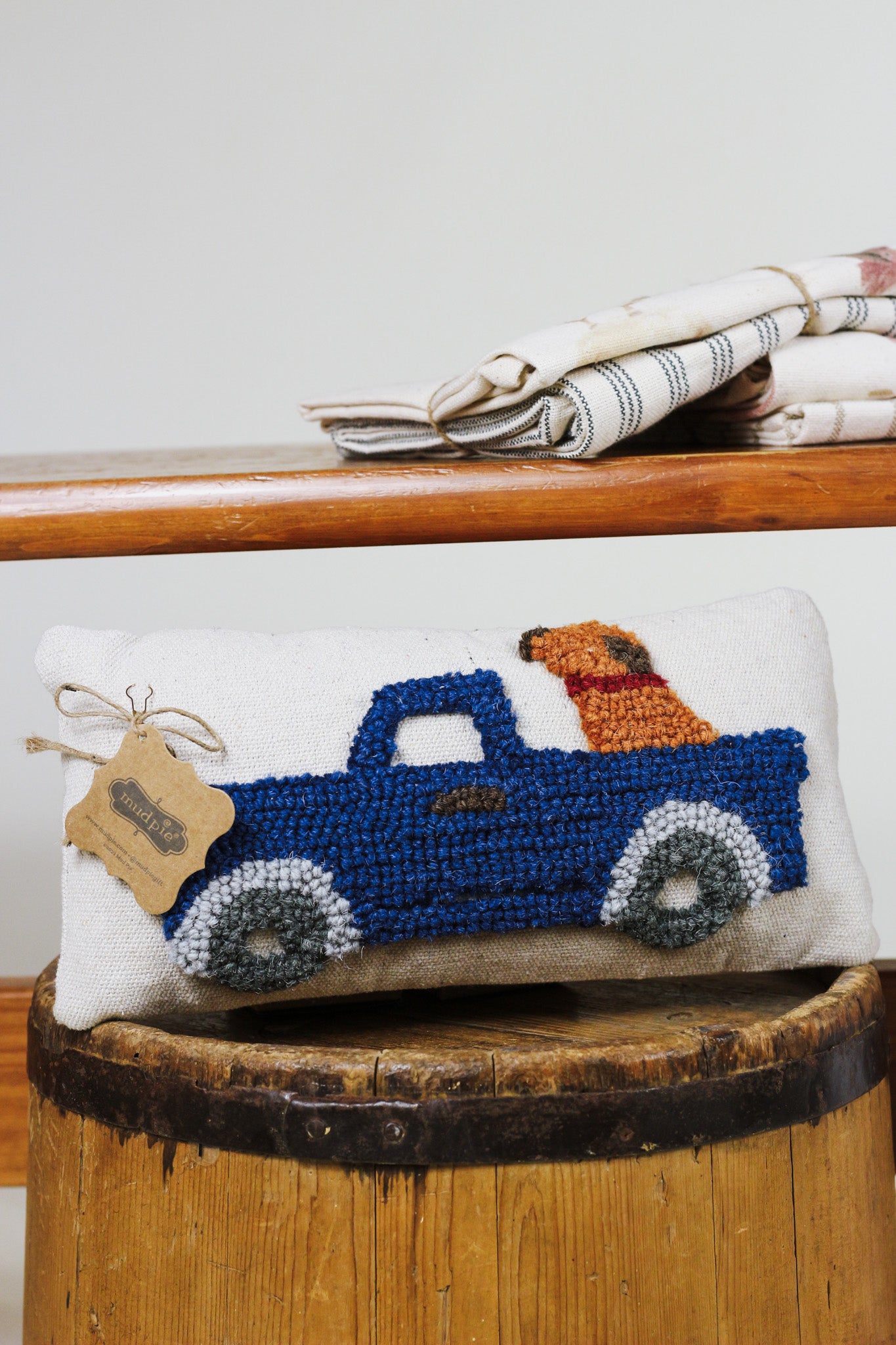 When it's your roost, it's your rules with our Dog Mini Hook Pillow. The canvas pillow features a hooked wool applique. The pillow features a truck with a dog in the back. Make sure to pair this pillow with our other Mini hook pillows for a complete Farmhouse matching set.