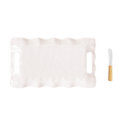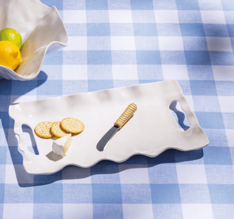 Elevate your entertaining experience with this exquisite Ruffled Melamine Tray Set. This 2-piece set combines functionality and style, featuring a shatterproof melamine tray designed with elegant ruffle edges and convenient side handles for easy carrying. The set includes a stainless steel spreader, beautifully crafted with a woven rattan handle, adding a touch of rustic charm.
