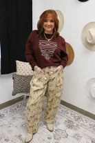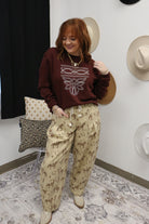Step into the saddle with style in these Prairie Plans Beige Western Barrel Pants. Crafted for riders who refuse to compromise on comfort or flair, these pants feature a flattering barrel cut that moves with you through every ride. The warm beige tone pairs effortlessly with your favorite boots and western wear, while the durable construction keeps up with your adventures. Whether you're hitting the arena or heading out on the trail, these pants deliver that perfect blend of authentic western charm and modern comfort. Yeehaw never looked so good!